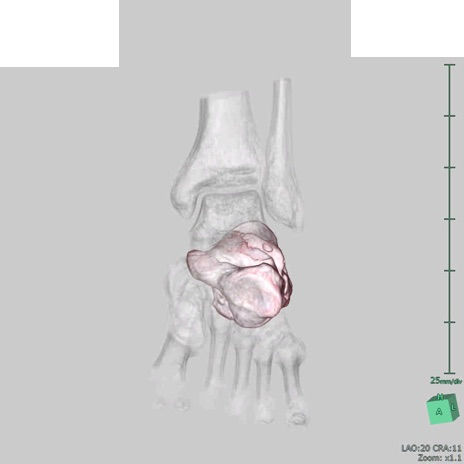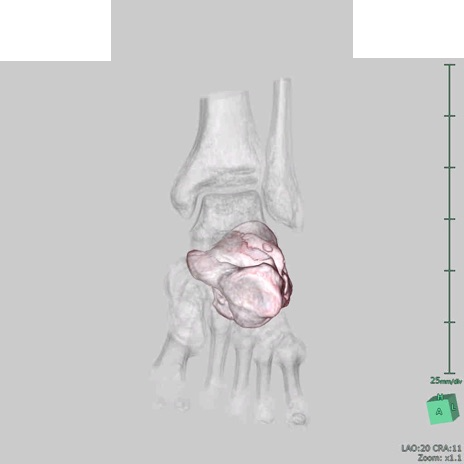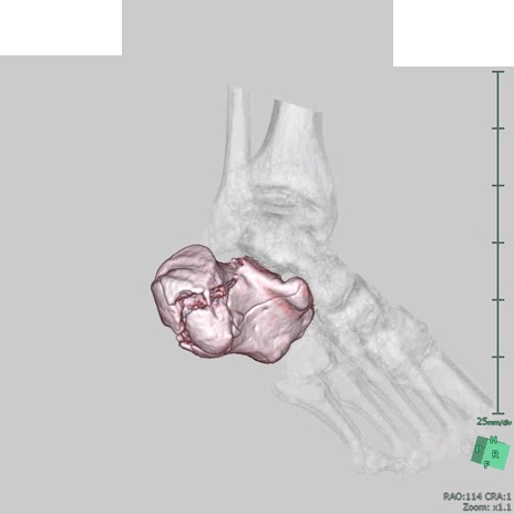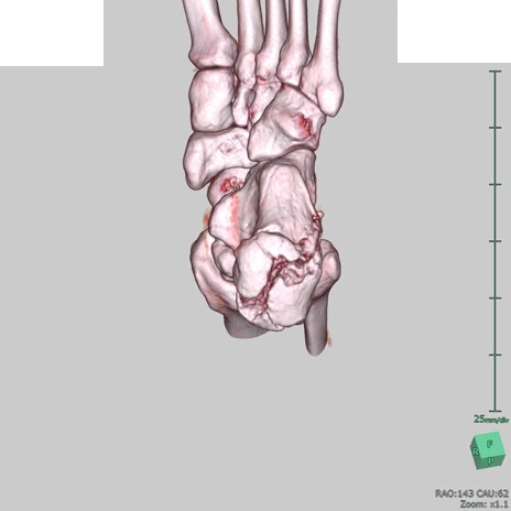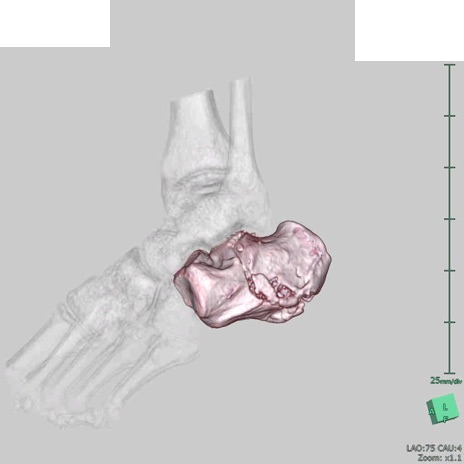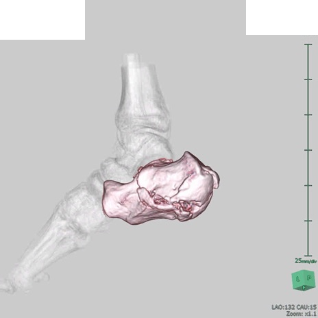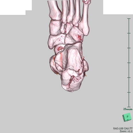 【症例】50歳代男性 【主訴】左踵部の痛み、腫脹 【現病歴】4日前に1.5m程度の高さのトラックの荷台から荷物と一緒に転落し、左足部を打撲。近医受診し、当院へ紹介受診となる。 【身体所見】左踵部の腫脹、圧痛あり。