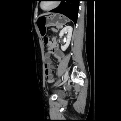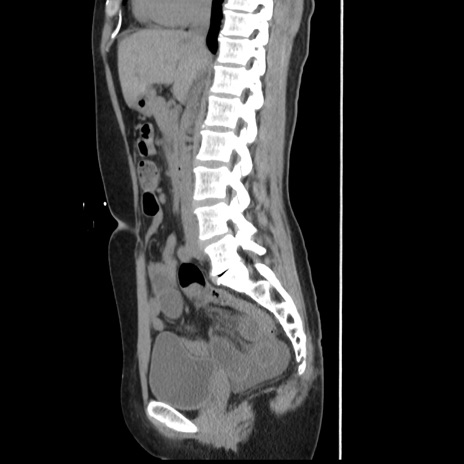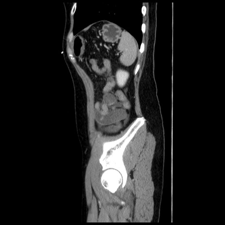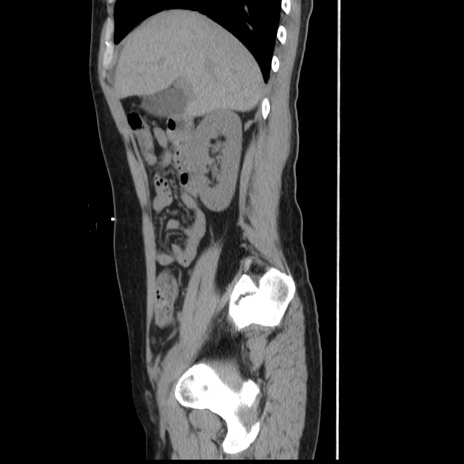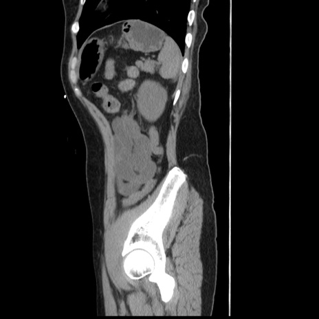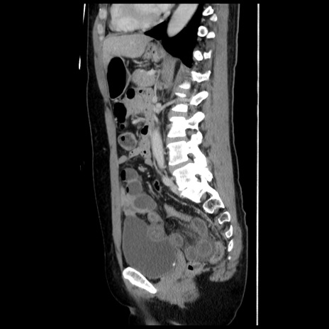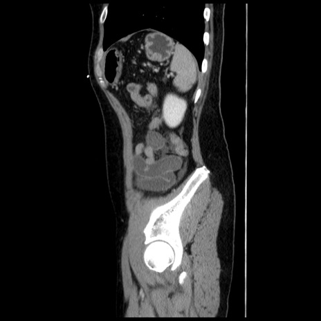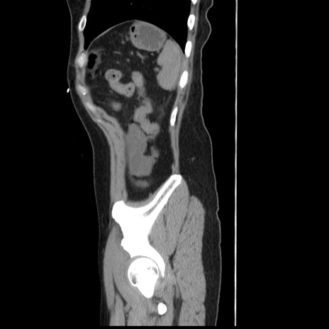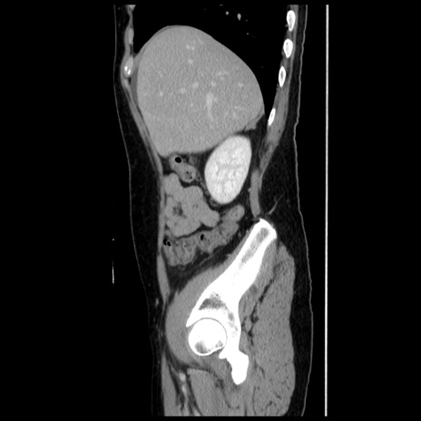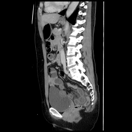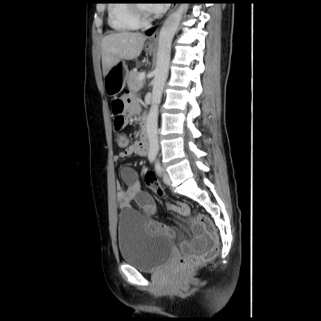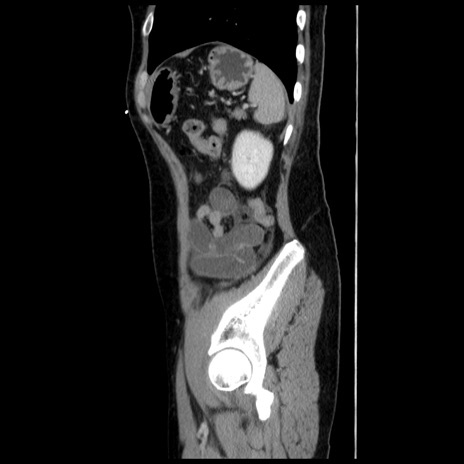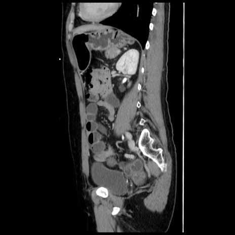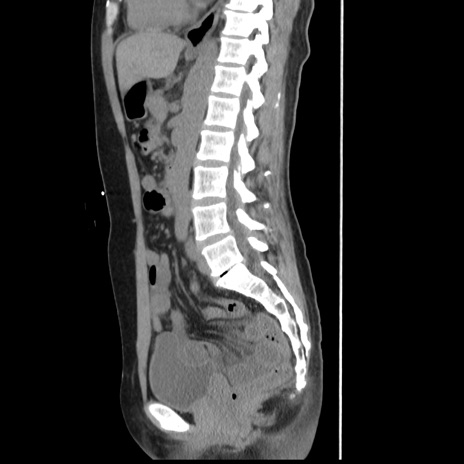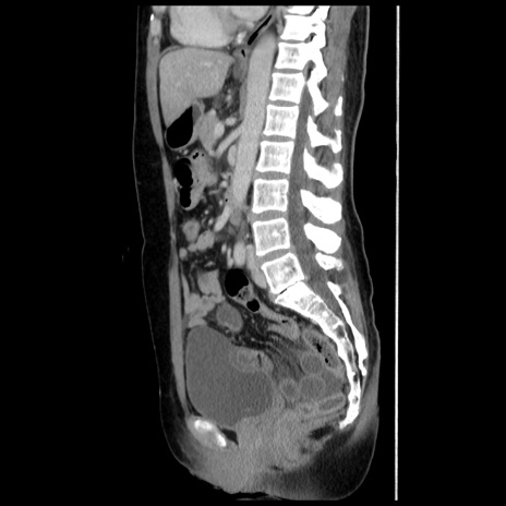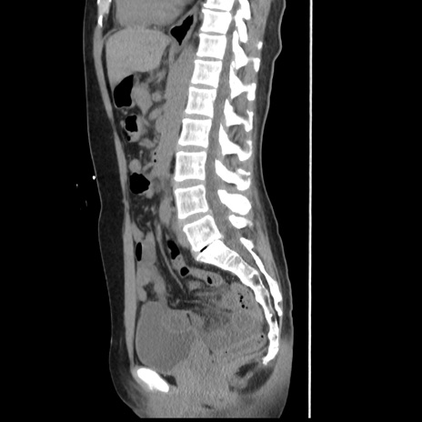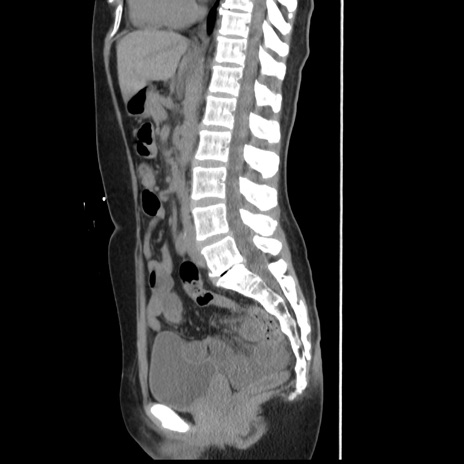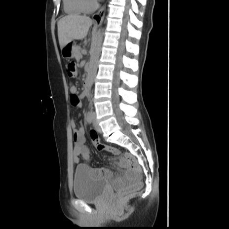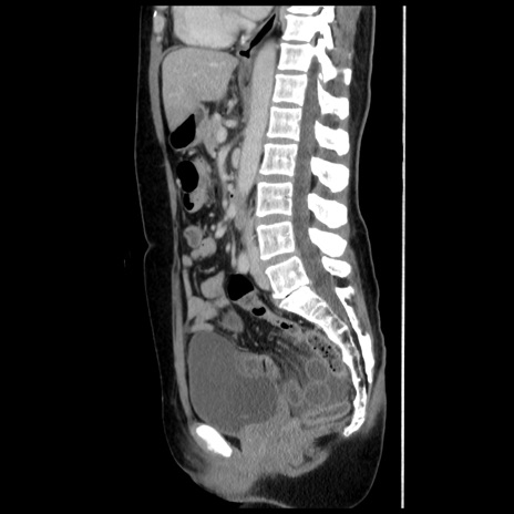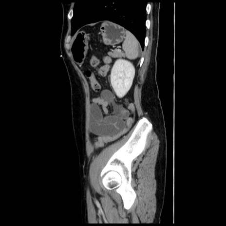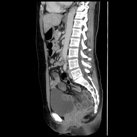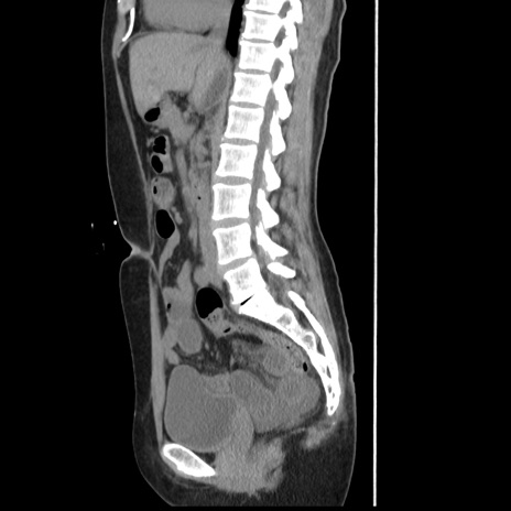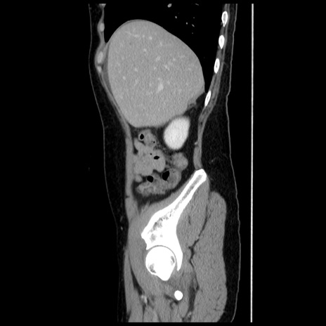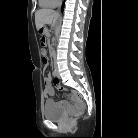 【症例】 50歳代女性 【主訴】 腹痛 【現病歴】前日生レバーを食べた。今朝に排便あり。 昼前に突然発症の腹痛を生じ、当院救急外来を受診した。 【既往歴】 子宮筋腫にてで子宮全摘後 【身体所見】 意識清明、腹部:平坦、軟、下腹部やや左を中心に圧痛・反跳痛あり、筋性防御あり 【データ】WBC 7800、CRP 0.07