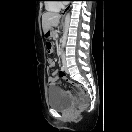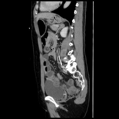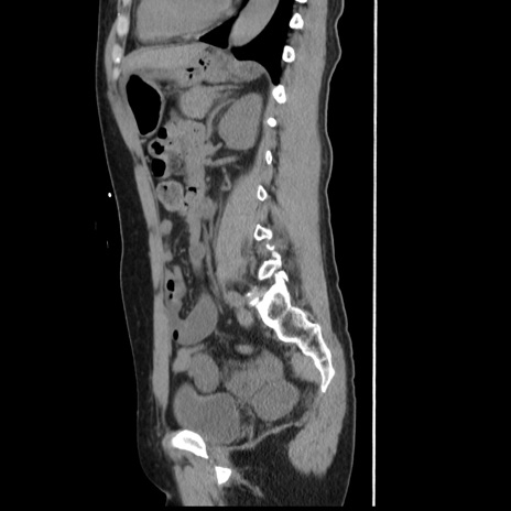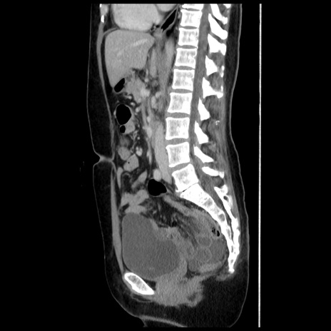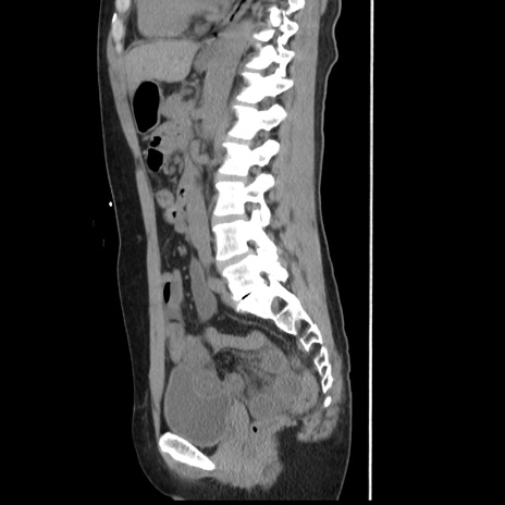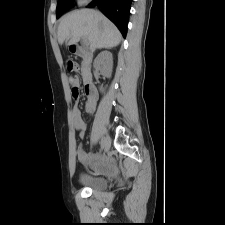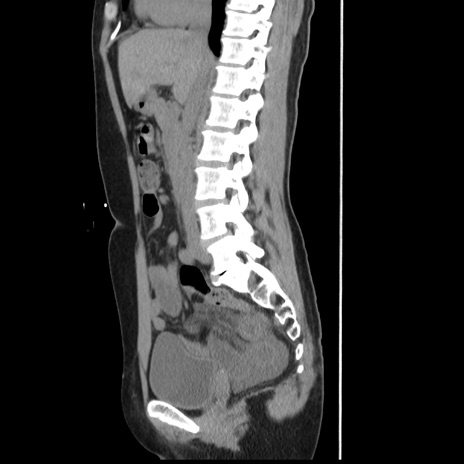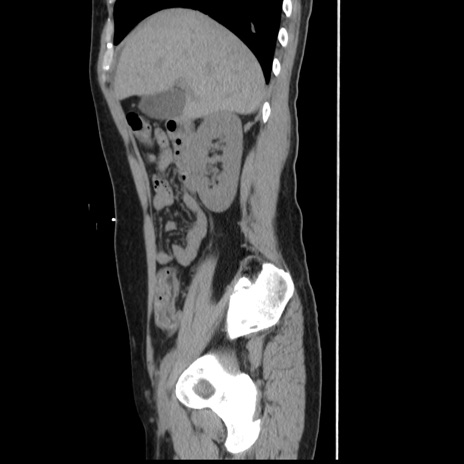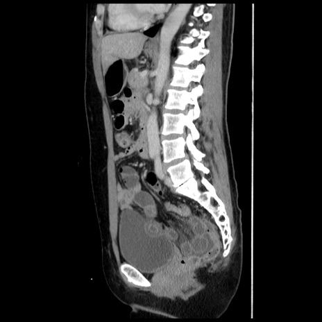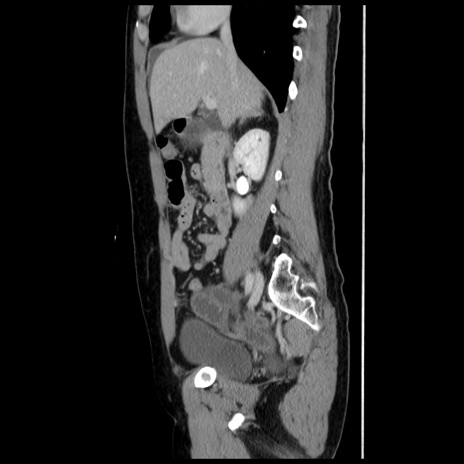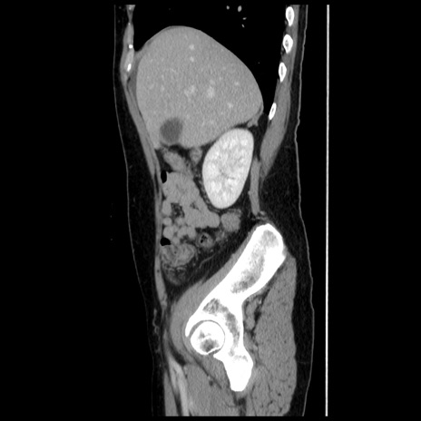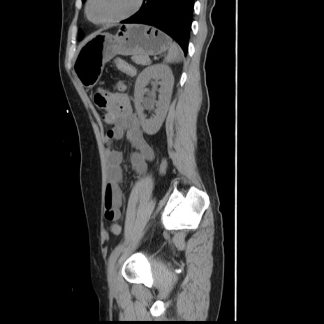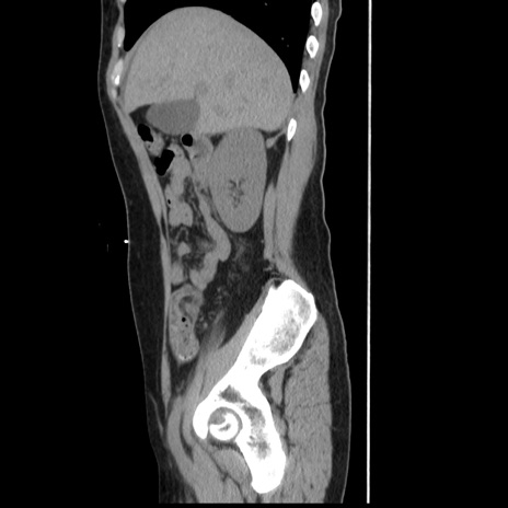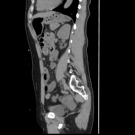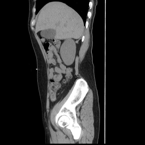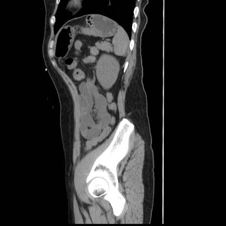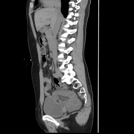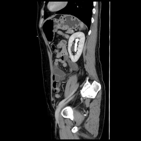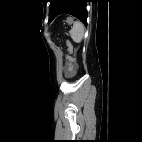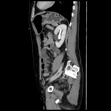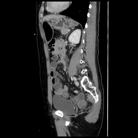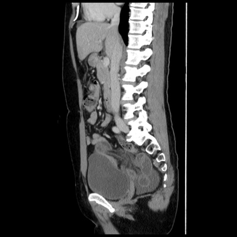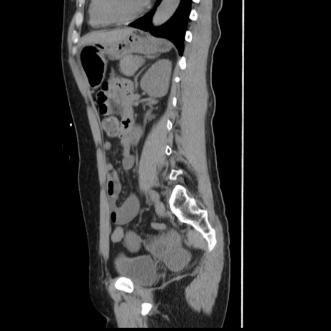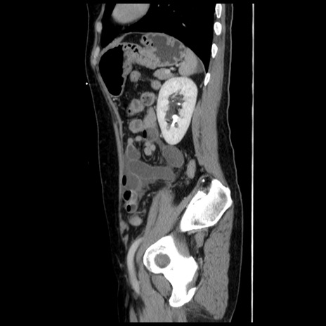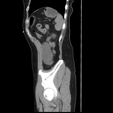【症例】 50歳代女性 【主訴】 腹痛 【現病歴】前日生レバーを食べた。今朝に排便あり。 昼前に突然発症の腹痛を生じ、当院救急外来を受診した。 【既往歴】 子宮筋腫にてで子宮全摘後 【身体所見】 意識清明、腹部:平坦、軟、下腹部やや左を中心に圧痛・反跳痛あり、筋性防御あり 【データ】WBC 7800、CRP 0.07