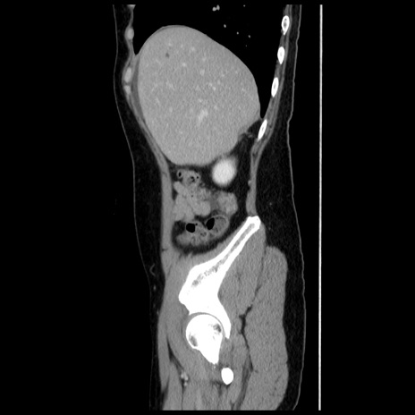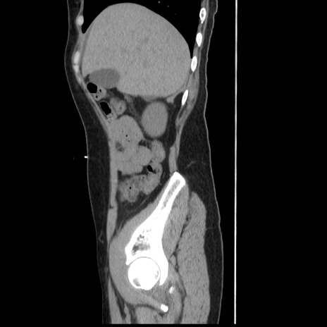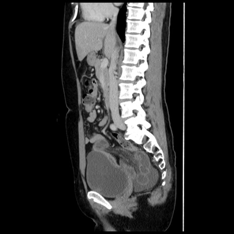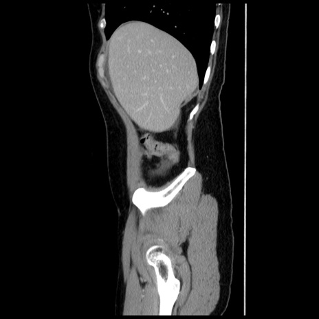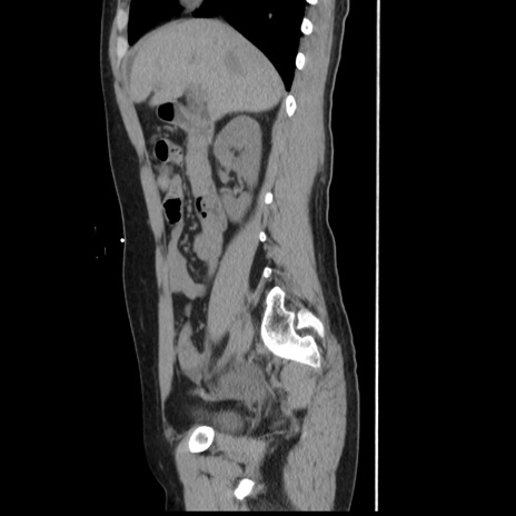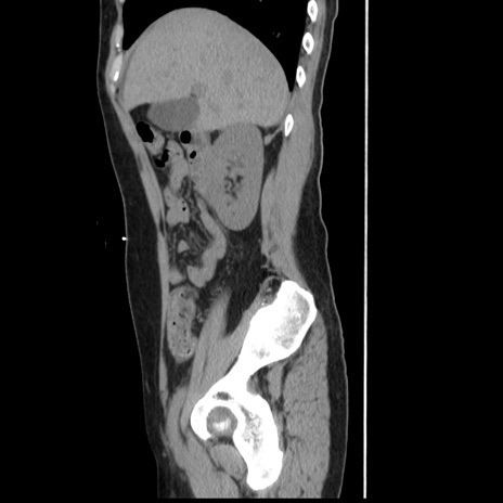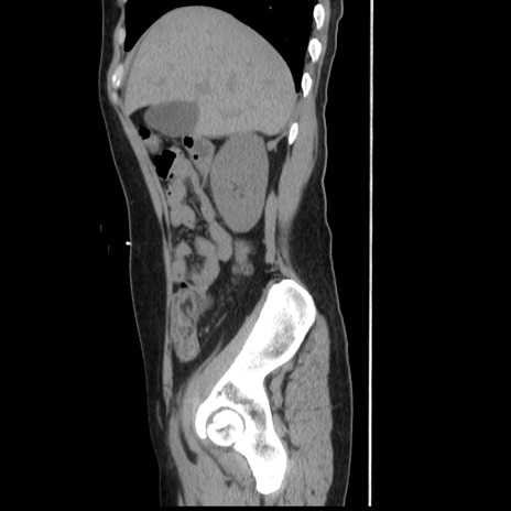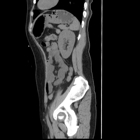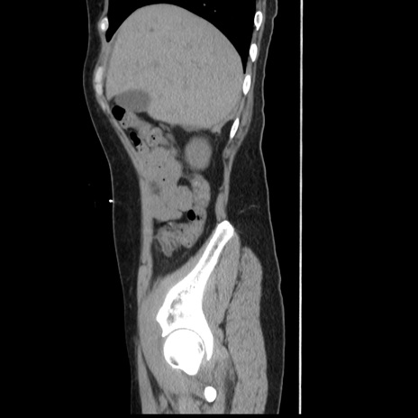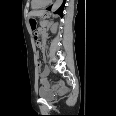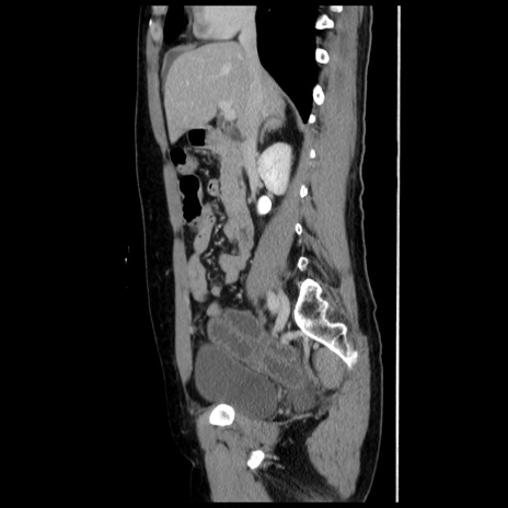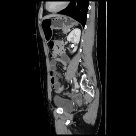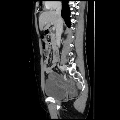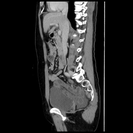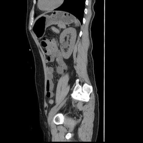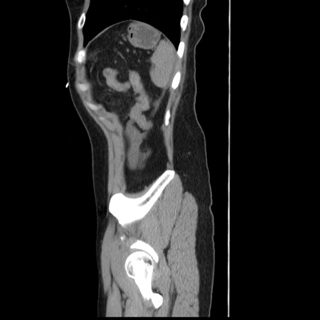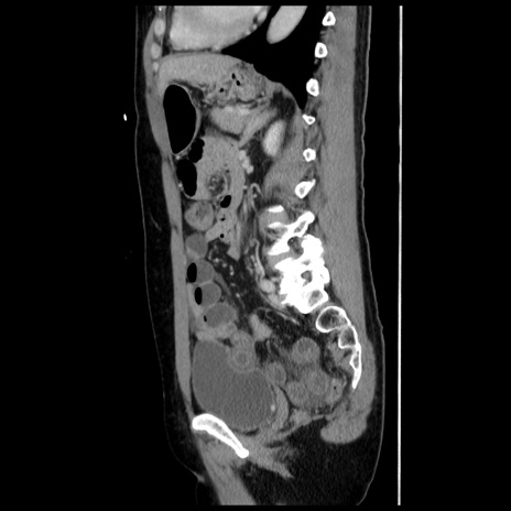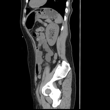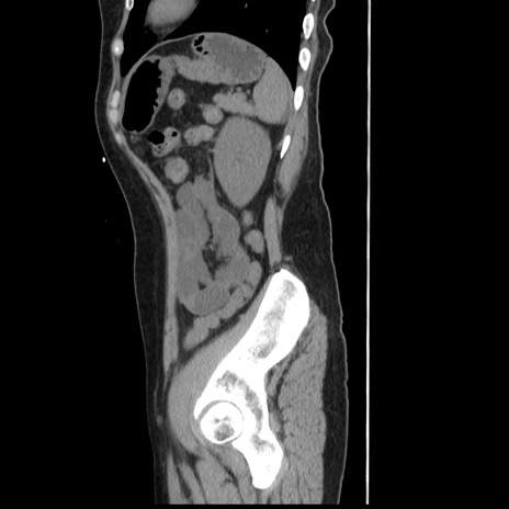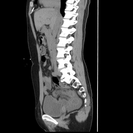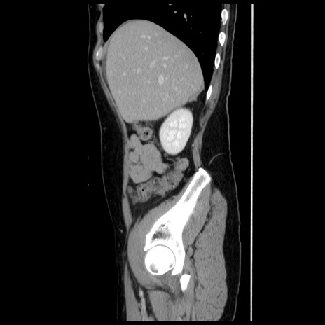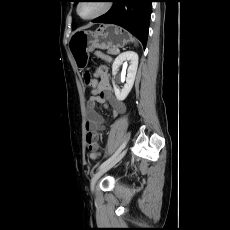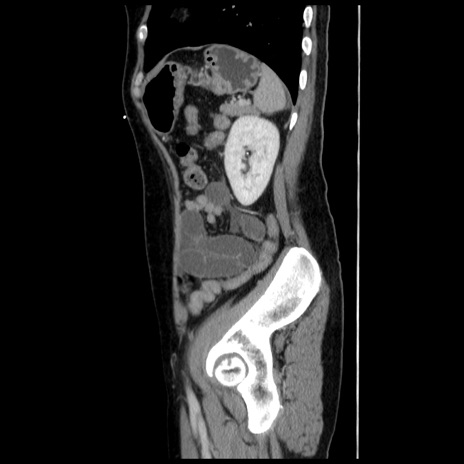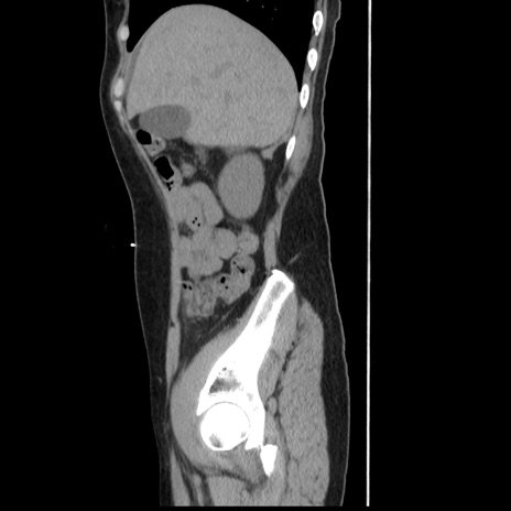 【症例】 50歳代女性 【主訴】 腹痛 【現病歴】前日生レバーを食べた。今朝に排便あり。 昼前に突然発症の腹痛を生じ、当院救急外来を受診した。 【既往歴】 子宮筋腫にてで子宮全摘後 【身体所見】 意識清明、腹部:平坦、軟、下腹部やや左を中心に圧痛・反跳痛あり、筋性防御あり 【データ】WBC 7800、CRP 0.07