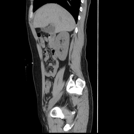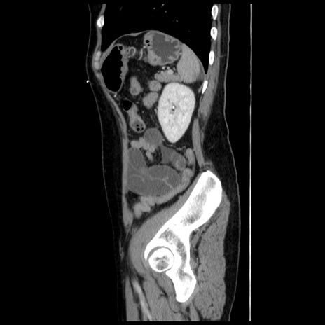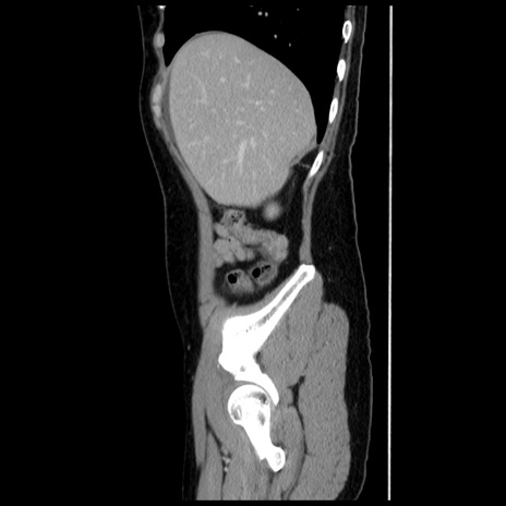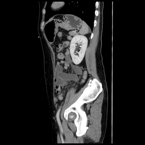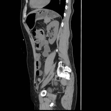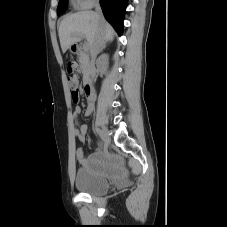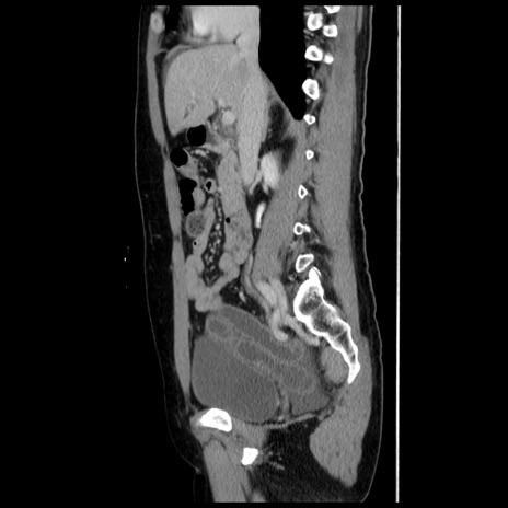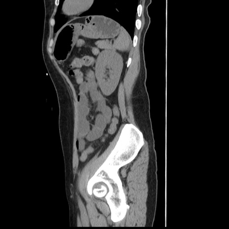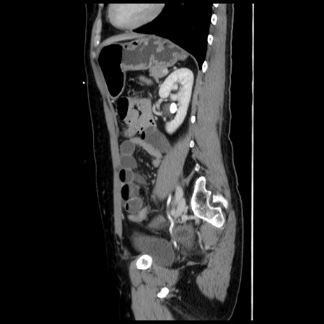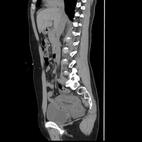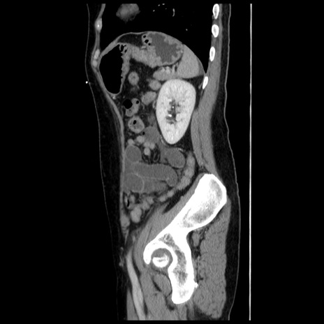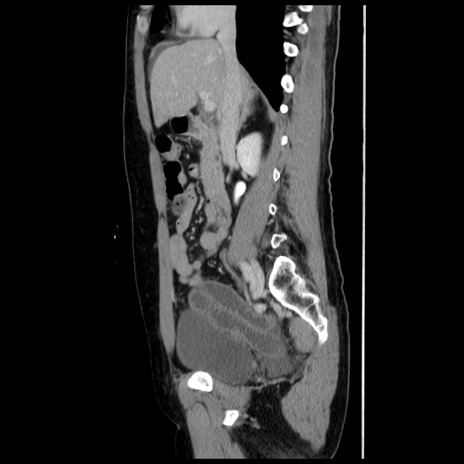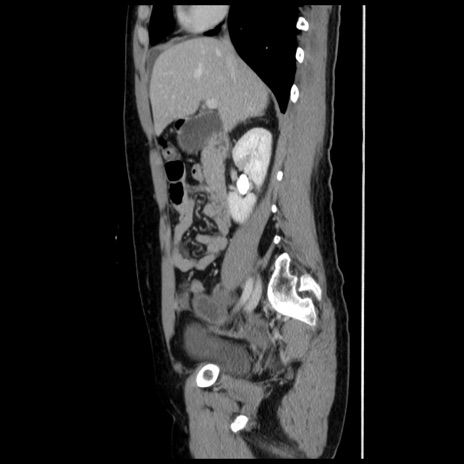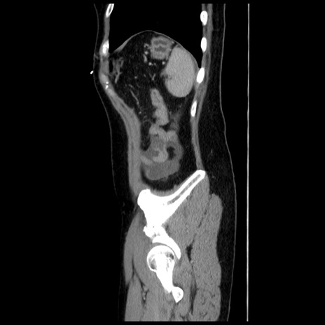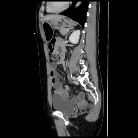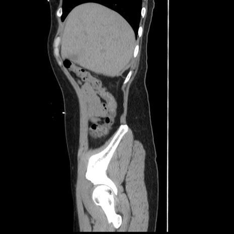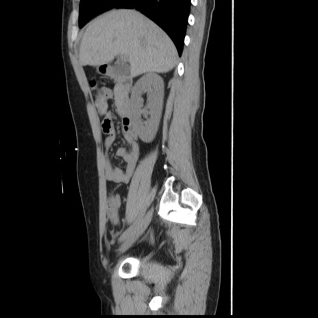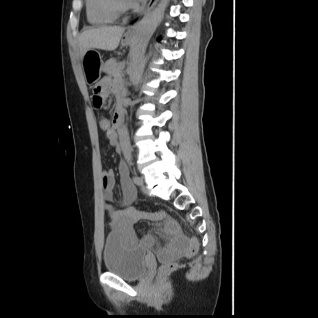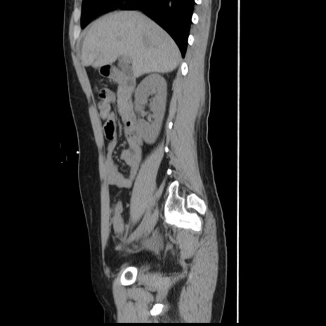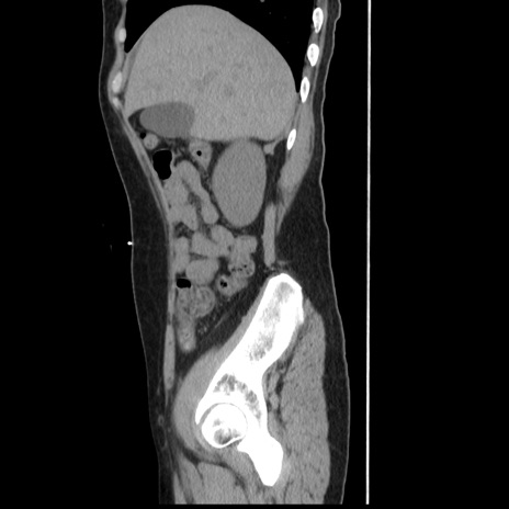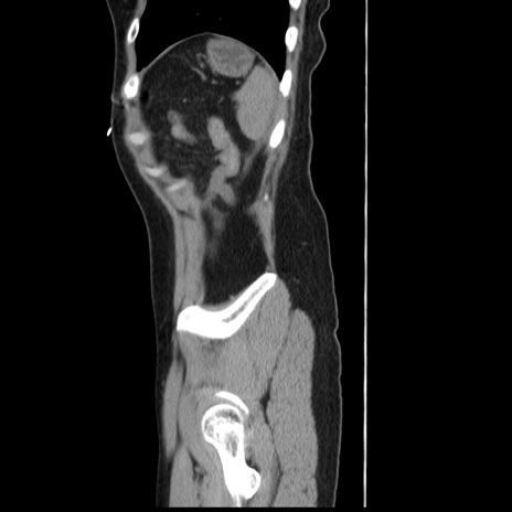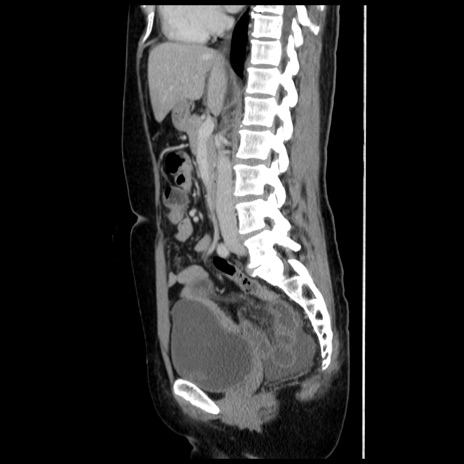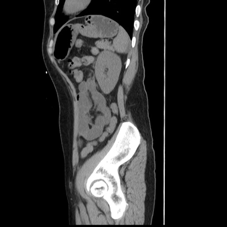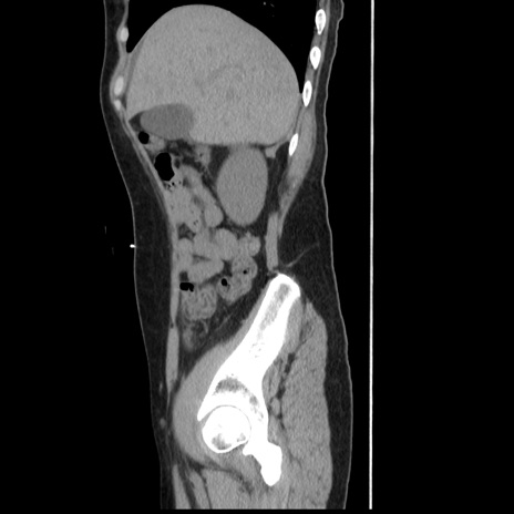 【症例】 50歳代女性 【主訴】 腹痛 【現病歴】前日生レバーを食べた。今朝に排便あり。 昼前に突然発症の腹痛を生じ、当院救急外来を受診した。 【既往歴】 子宮筋腫にてで子宮全摘後 【身体所見】 意識清明、腹部:平坦、軟、下腹部やや左を中心に圧痛・反跳痛あり、筋性防御あり 【データ】WBC 7800、CRP 0.07
