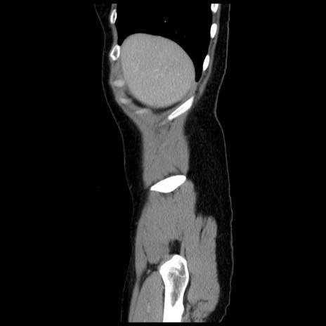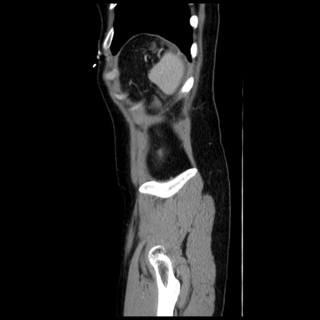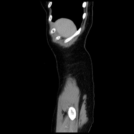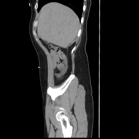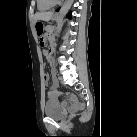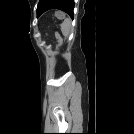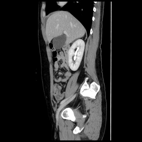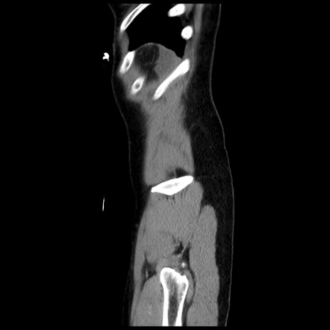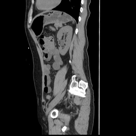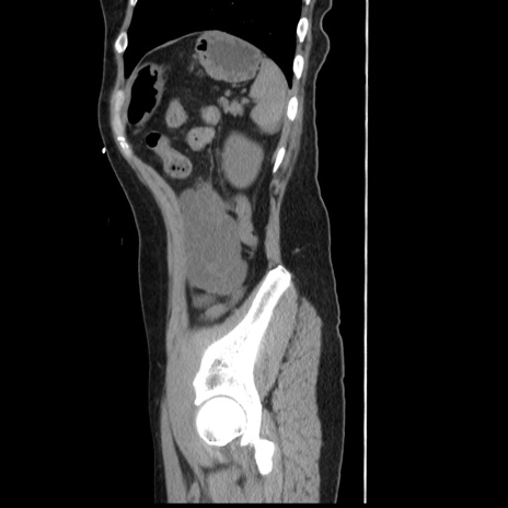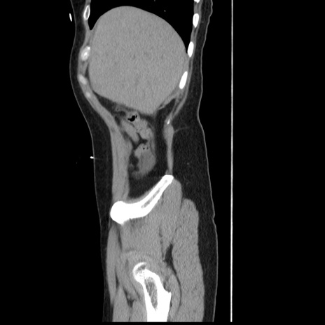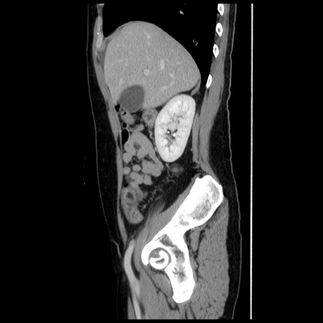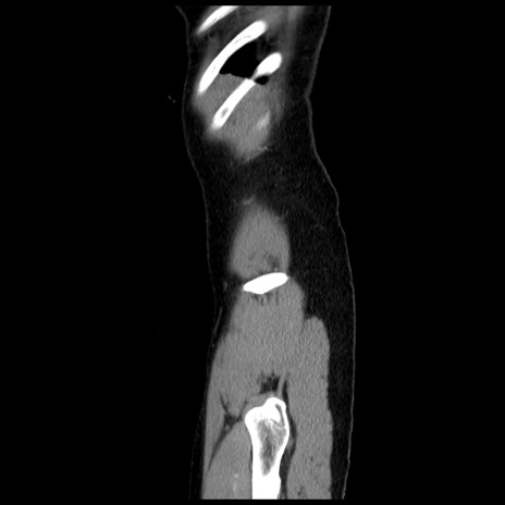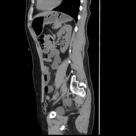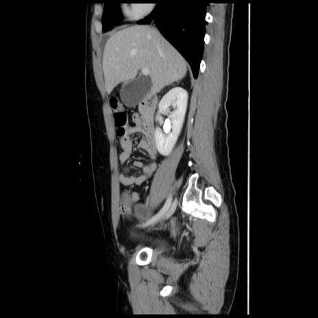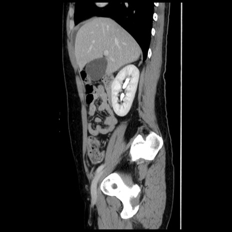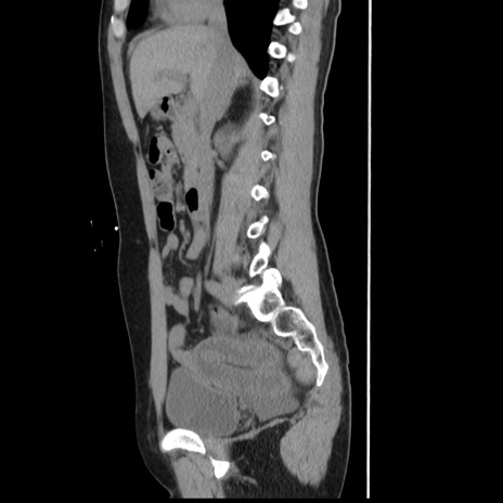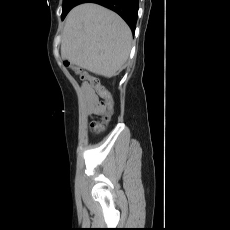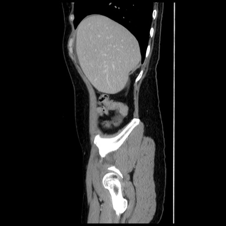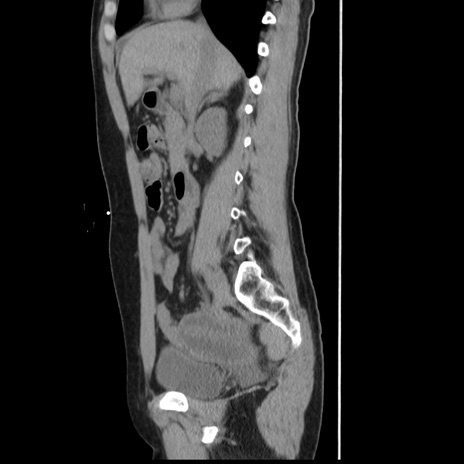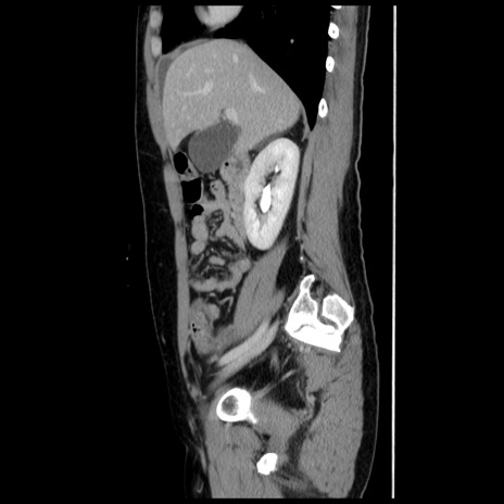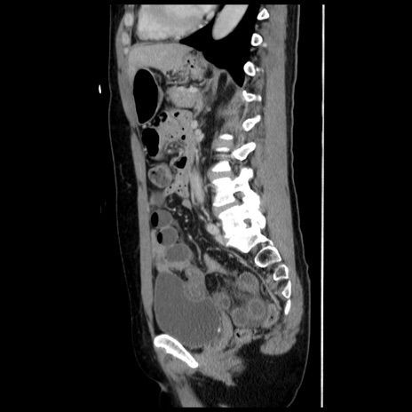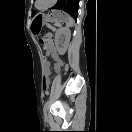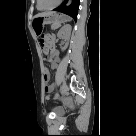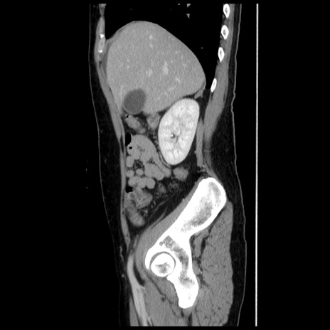 【症例】 50歳代女性 【主訴】 腹痛 【現病歴】前日生レバーを食べた。今朝に排便あり。 昼前に突然発症の腹痛を生じ、当院救急外来を受診した。 【既往歴】 子宮筋腫にてで子宮全摘後 【身体所見】 意識清明、腹部:平坦、軟、下腹部やや左を中心に圧痛・反跳痛あり、筋性防御あり 【データ】WBC 7800、CRP 0.07