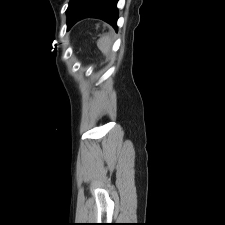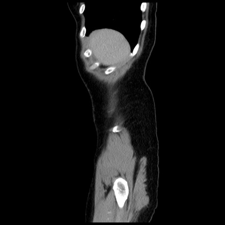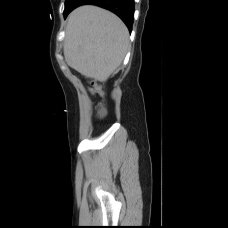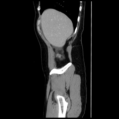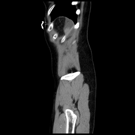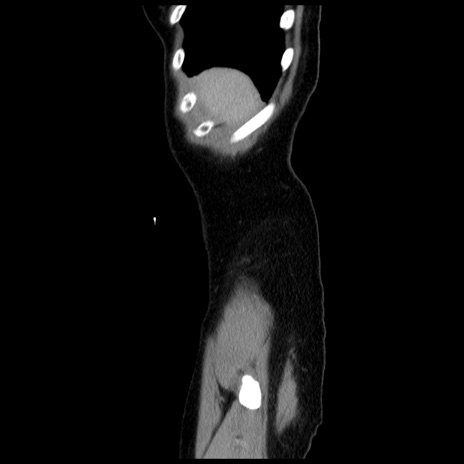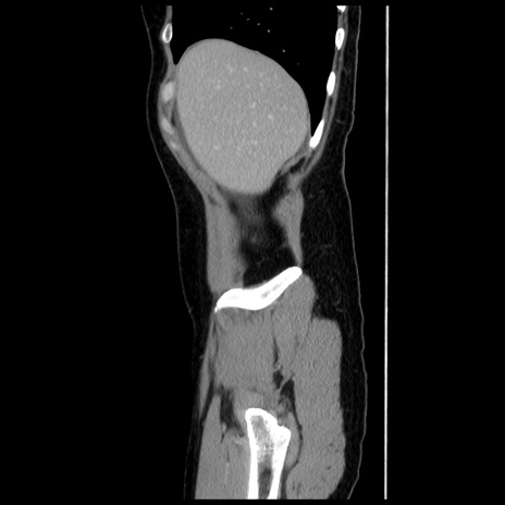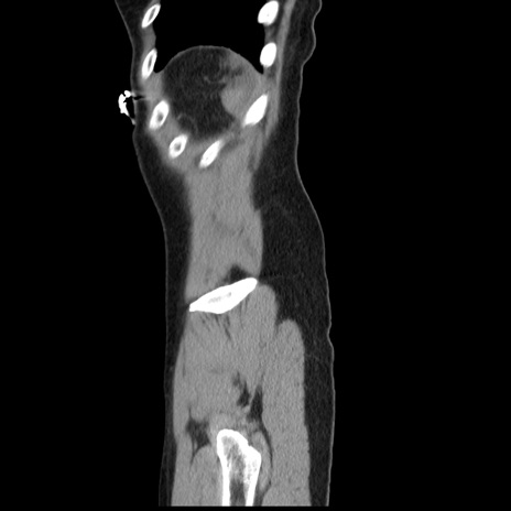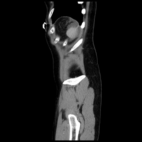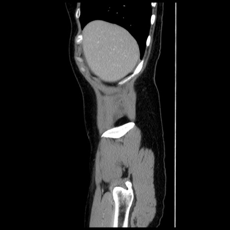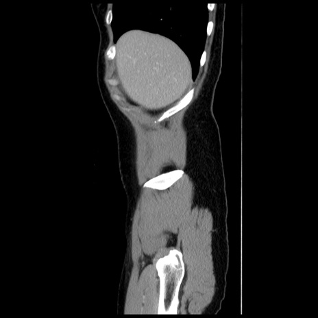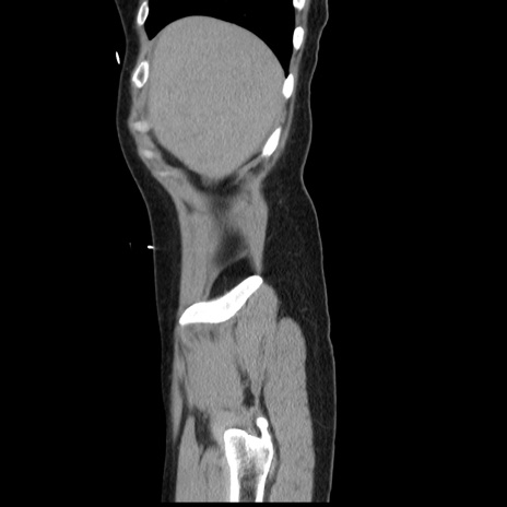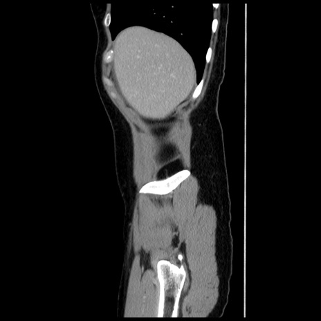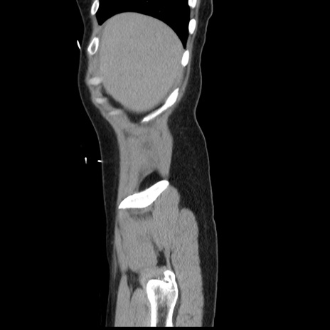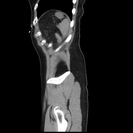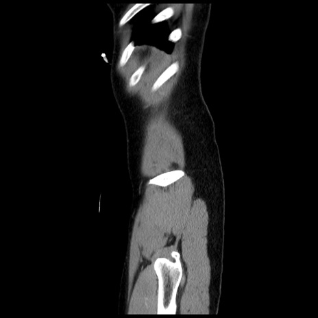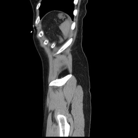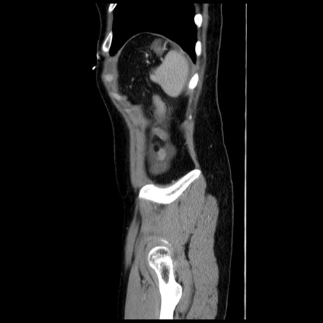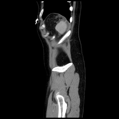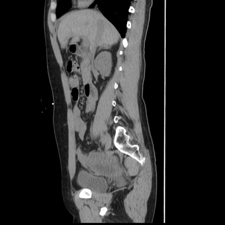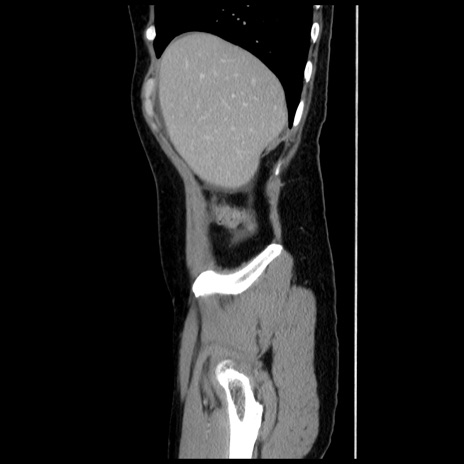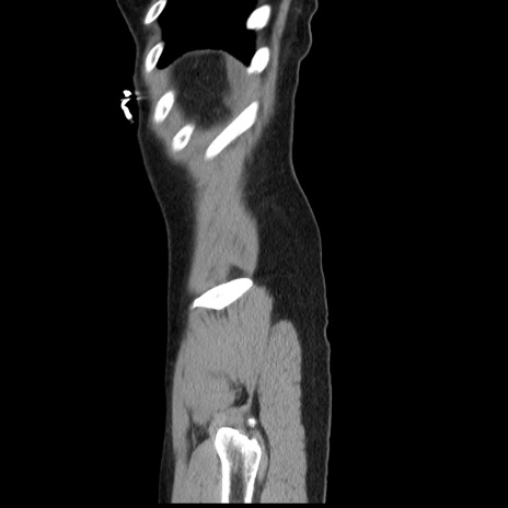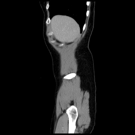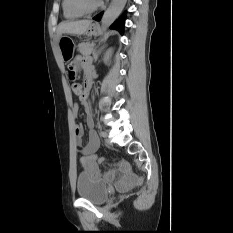 【症例】 50歳代女性 【主訴】 腹痛 【現病歴】前日生レバーを食べた。今朝に排便あり。 昼前に突然発症の腹痛を生じ、当院救急外来を受診した。 【既往歴】 子宮筋腫にてで子宮全摘後 【身体所見】 意識清明、腹部:平坦、軟、下腹部やや左を中心に圧痛・反跳痛あり、筋性防御あり 【データ】WBC 7800、CRP 0.07