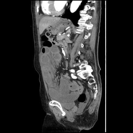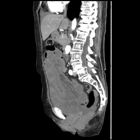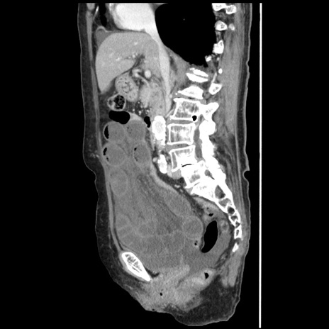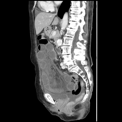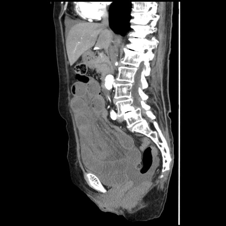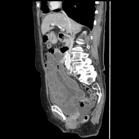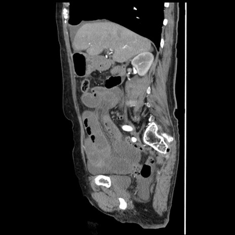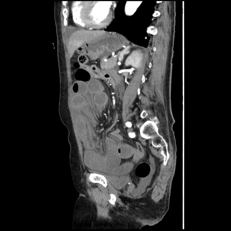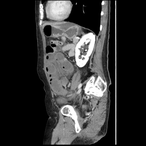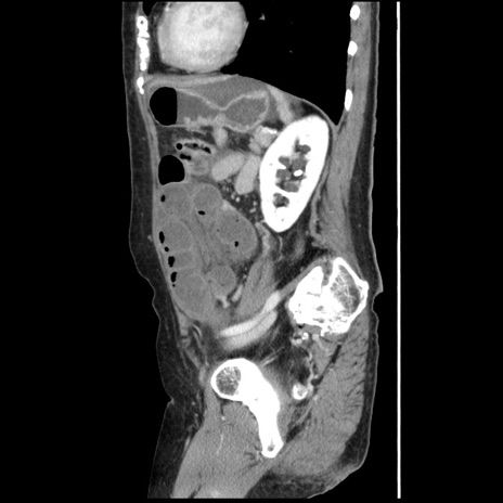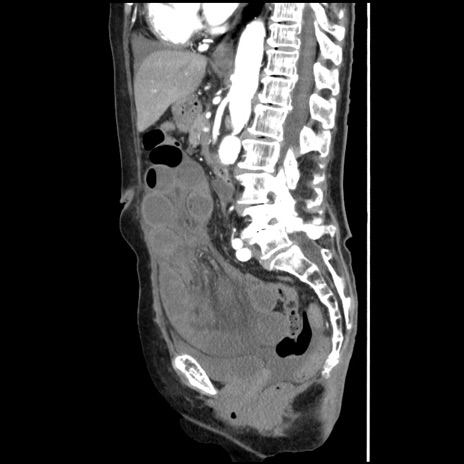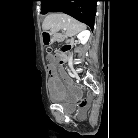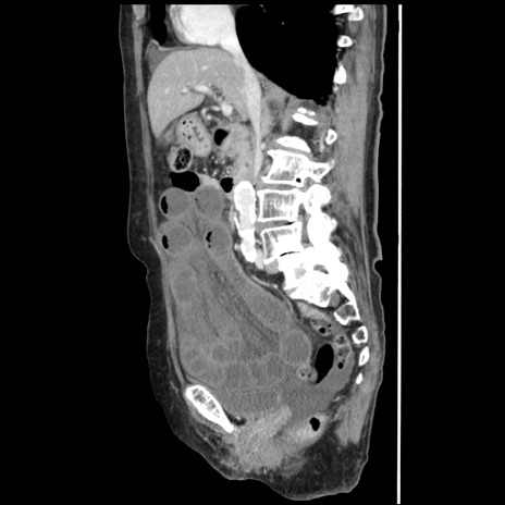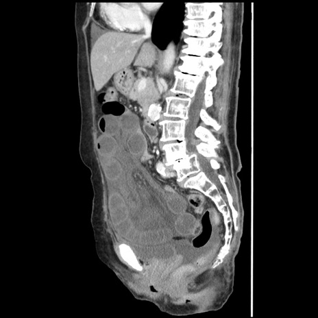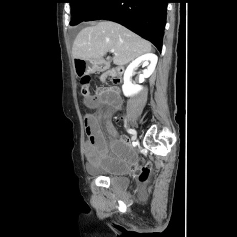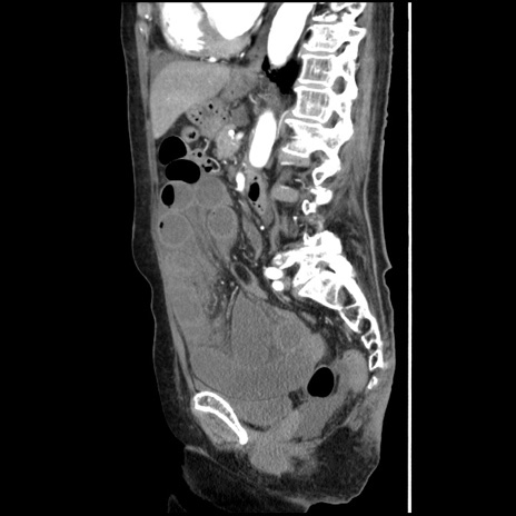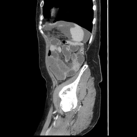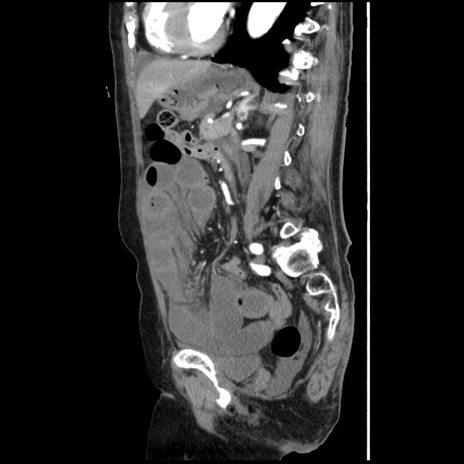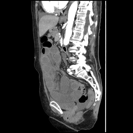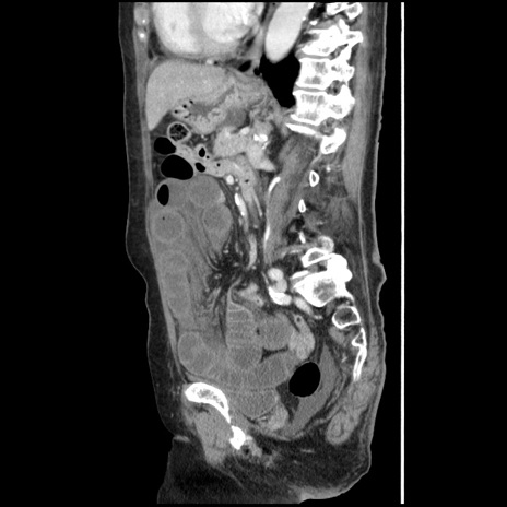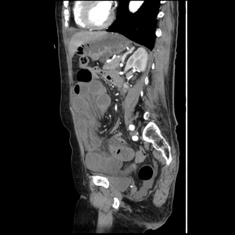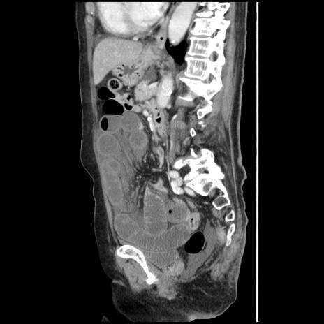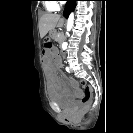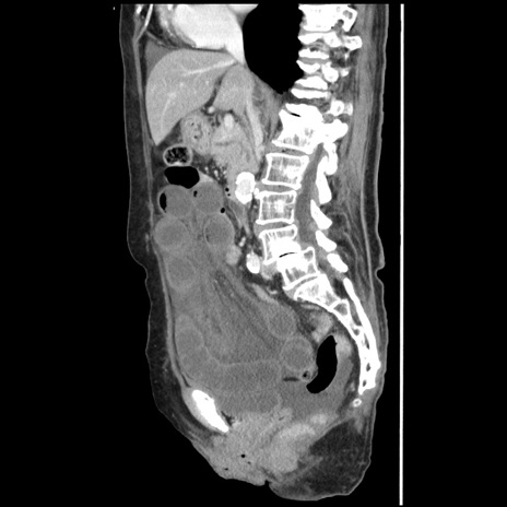 【症例】80歳代女性 【主訴】腹痛 【現病歴】8時間前から腹痛あり来院。 【既往歴】糖尿病、脂質異常症、子宮体癌にて子宮全摘術 【身体所見】意識清明・会話良好だが腹痛で苦悶様、全腹部にわたって反跳痛と圧痛あり 【データ】WBC 13600、CRP 0.14、LDH 224、CK 90