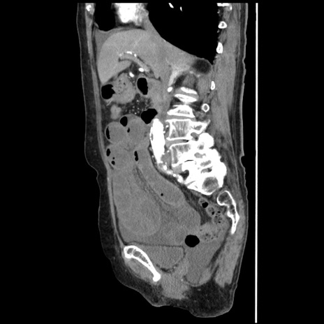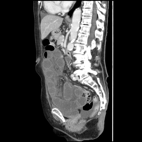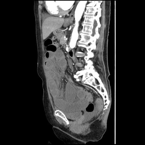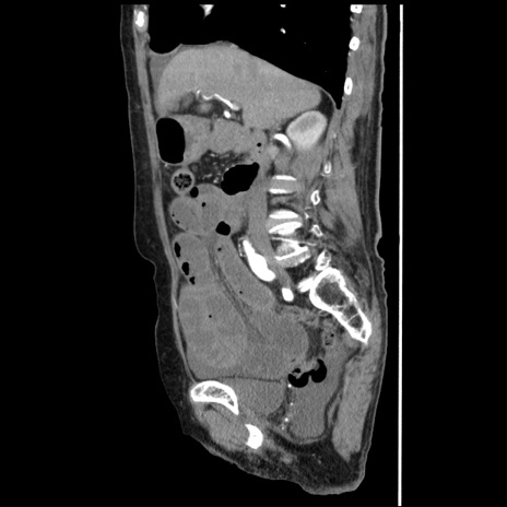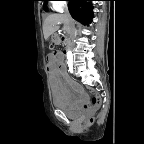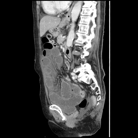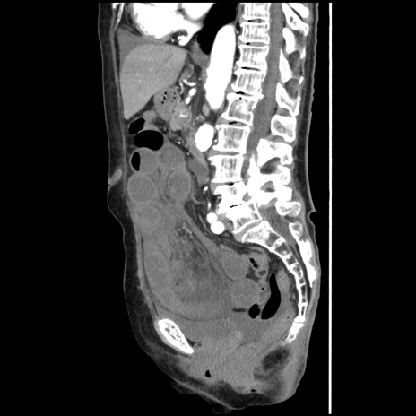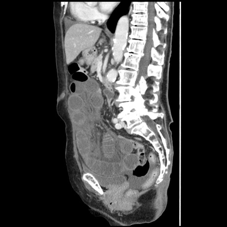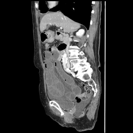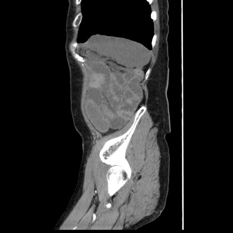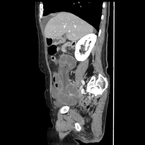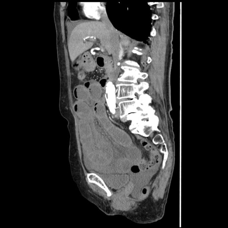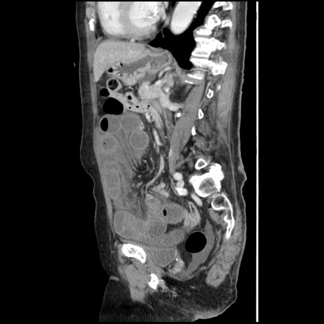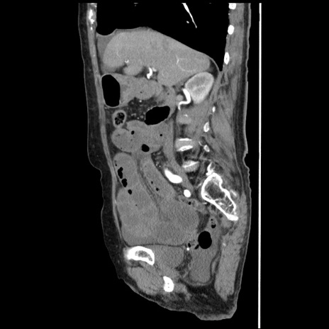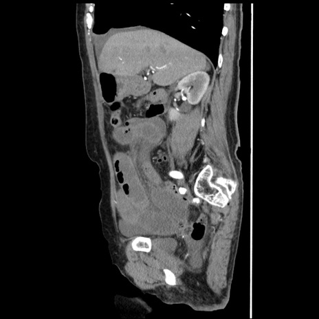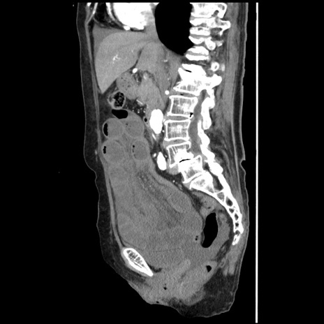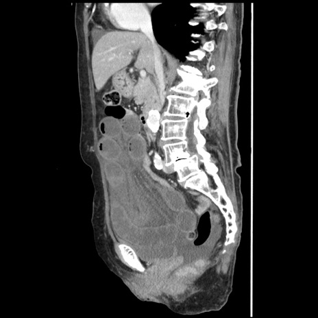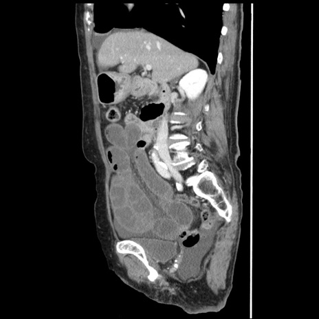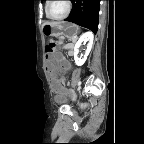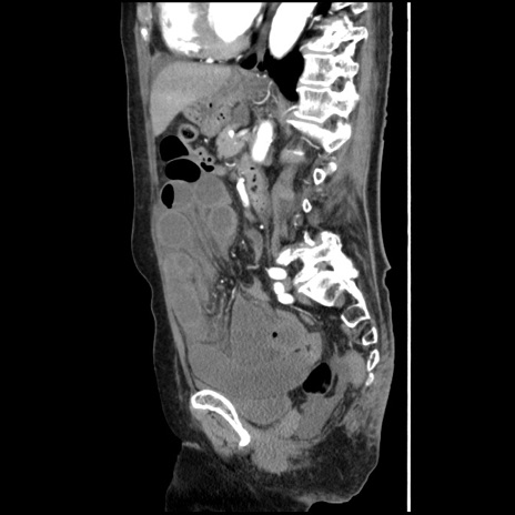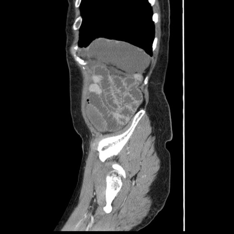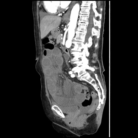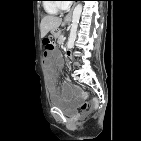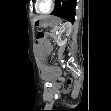【症例】80歳代女性 【主訴】腹痛 【現病歴】8時間前から腹痛あり来院。 【既往歴】糖尿病、脂質異常症、子宮体癌にて子宮全摘術 【身体所見】意識清明・会話良好だが腹痛で苦悶様、全腹部にわたって反跳痛と圧痛あり 【データ】WBC 13600、CRP 0.14、LDH 224、CK 90