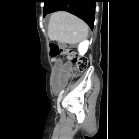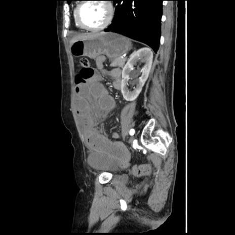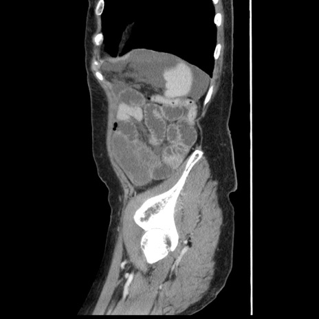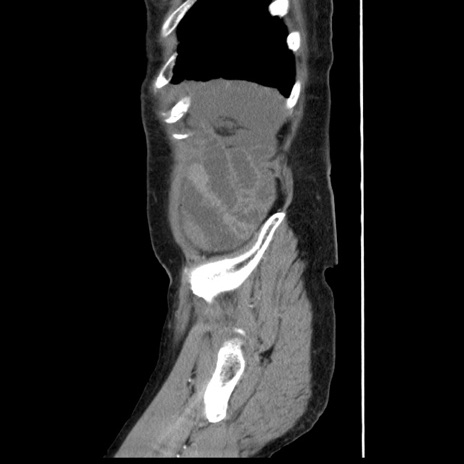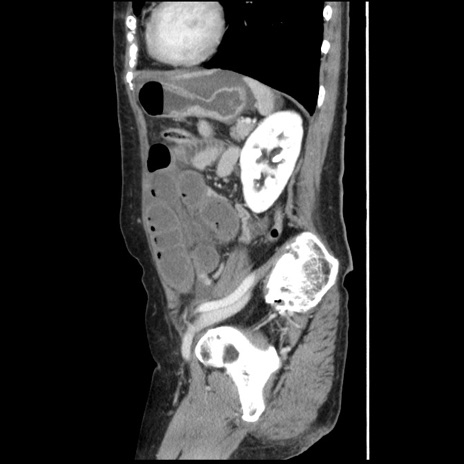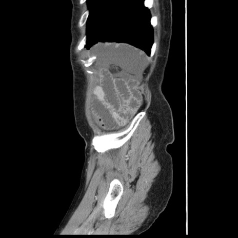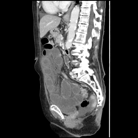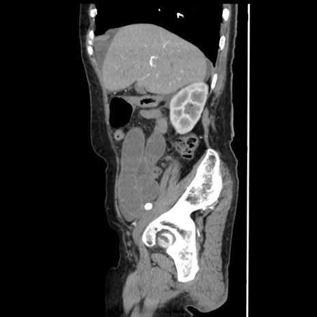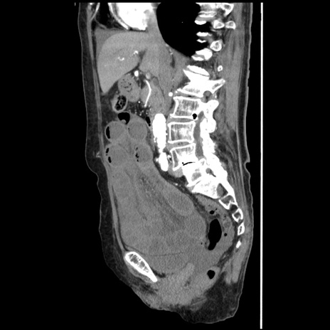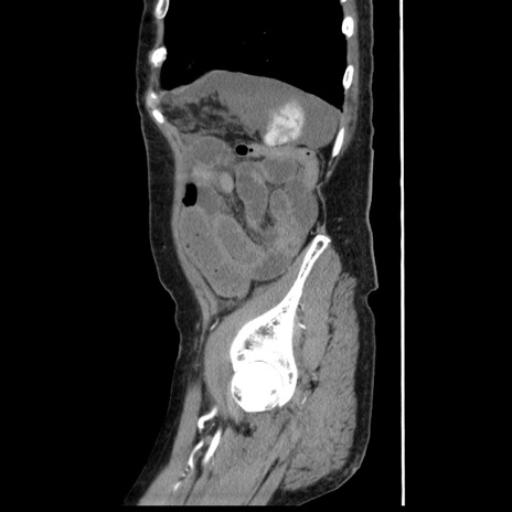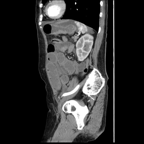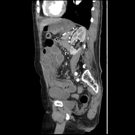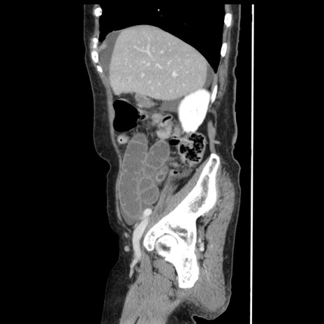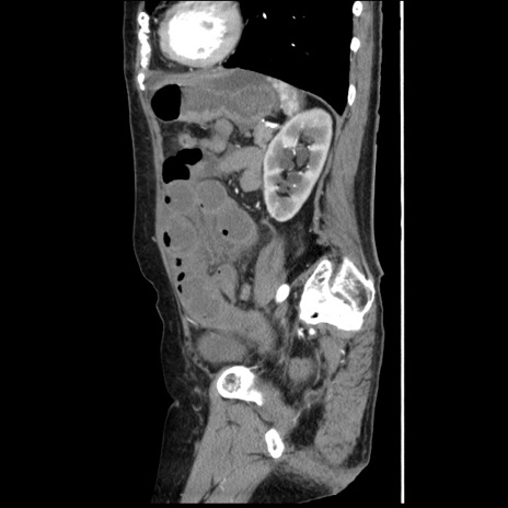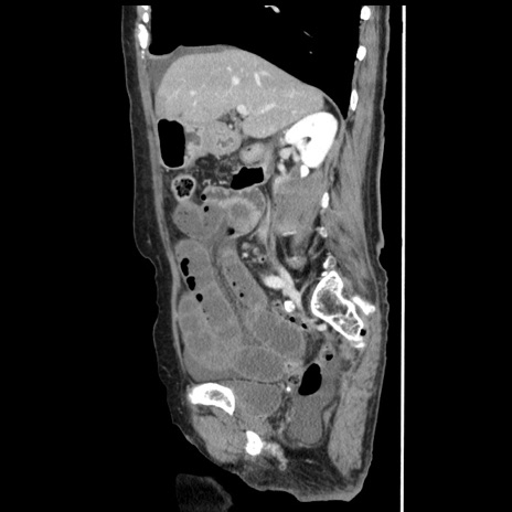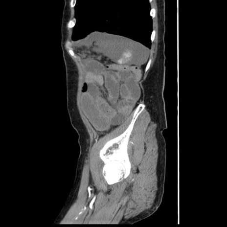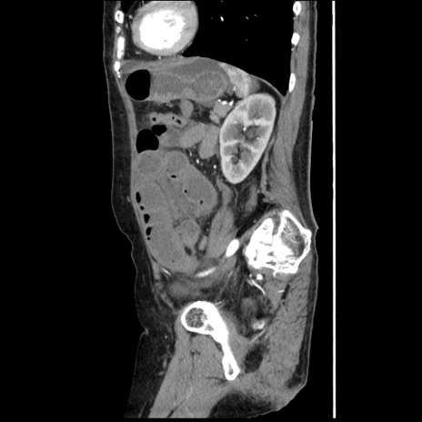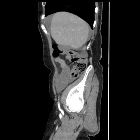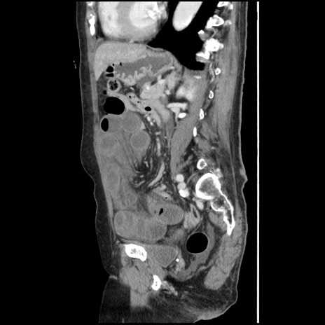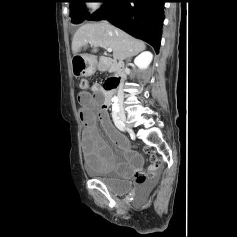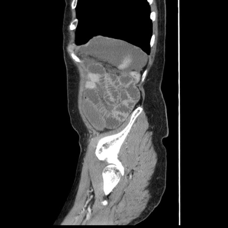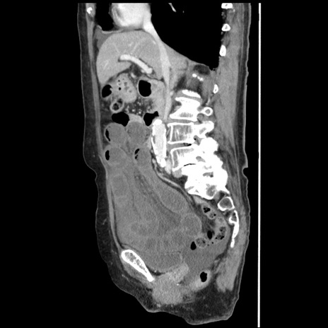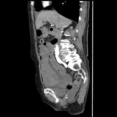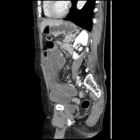 【症例】80歳代女性 【主訴】腹痛 【現病歴】8時間前から腹痛あり来院。 【既往歴】糖尿病、脂質異常症、子宮体癌にて子宮全摘術 【身体所見】意識清明・会話良好だが腹痛で苦悶様、全腹部にわたって反跳痛と圧痛あり 【データ】WBC 13600、CRP 0.14、LDH 224、CK 90