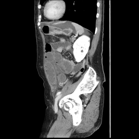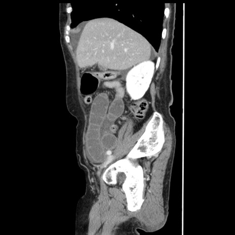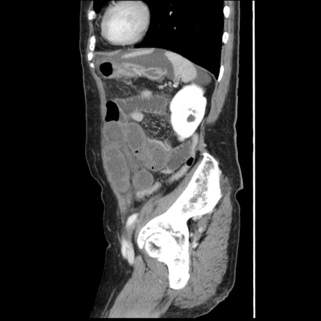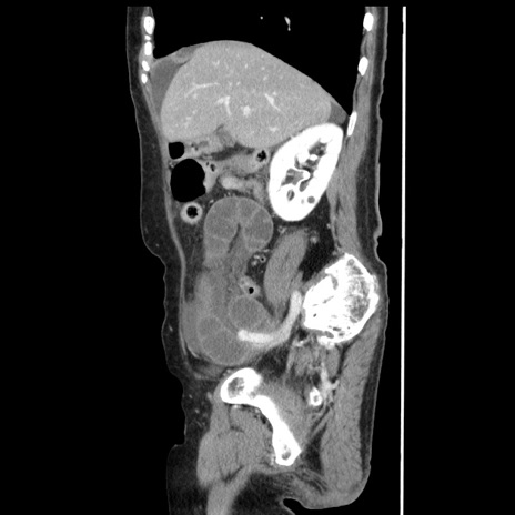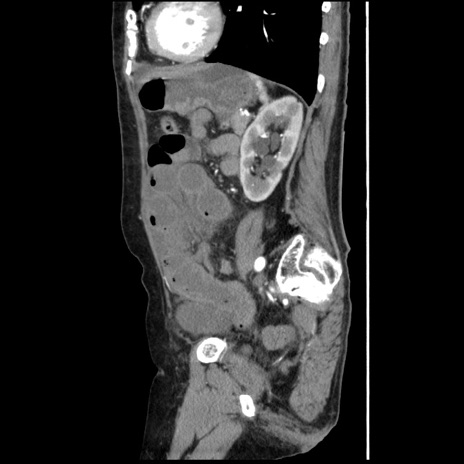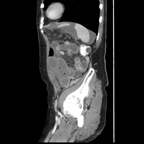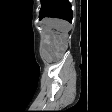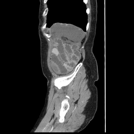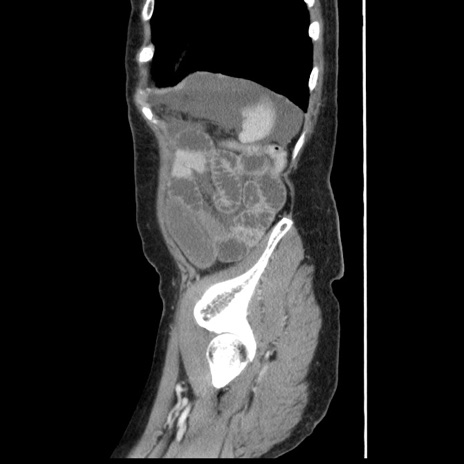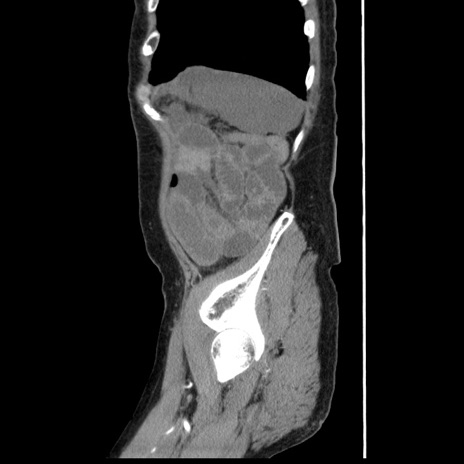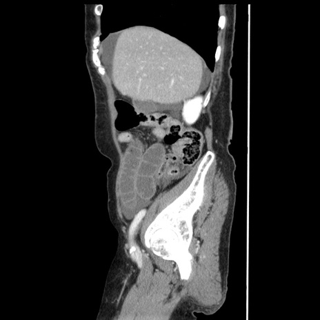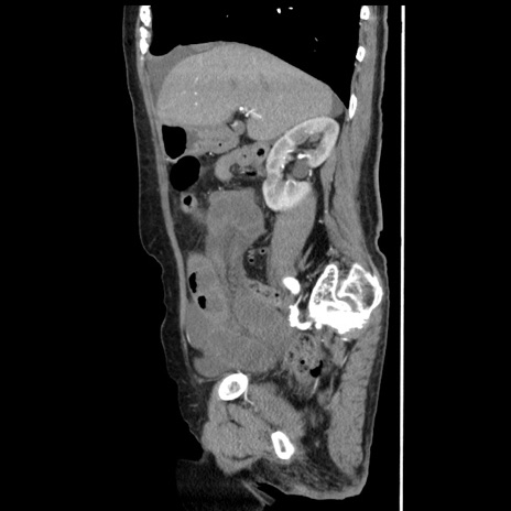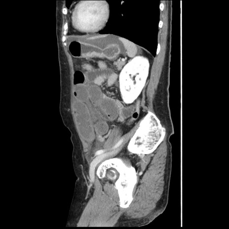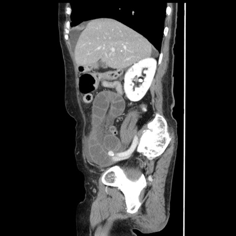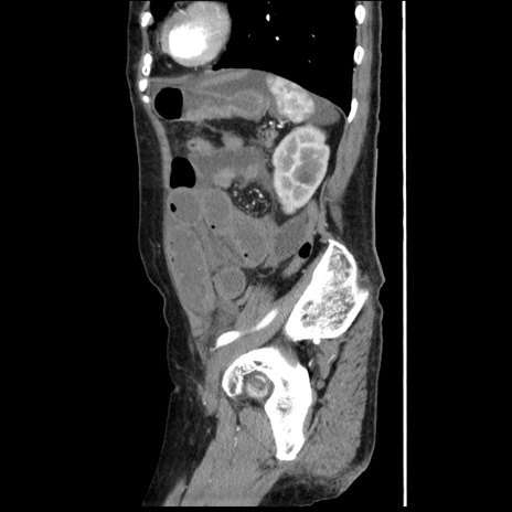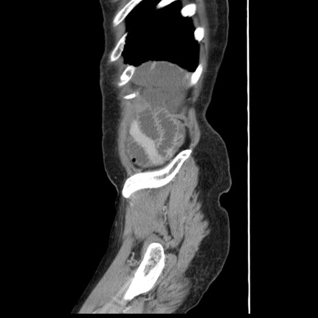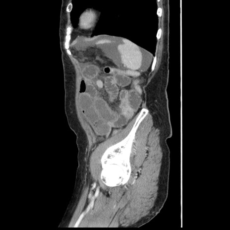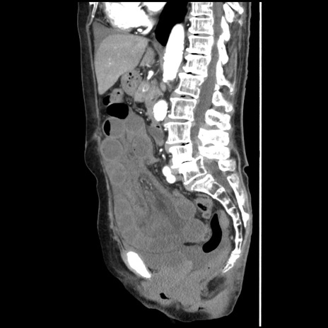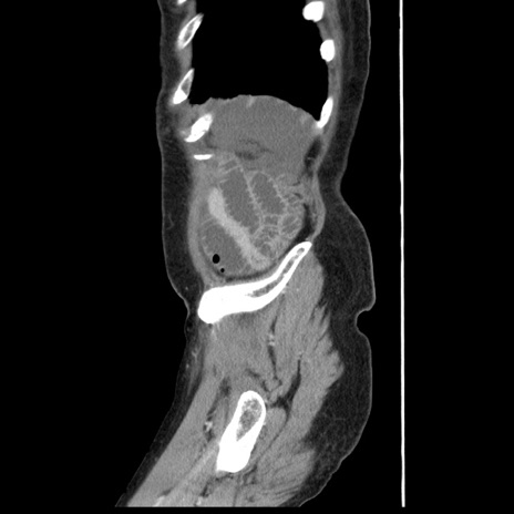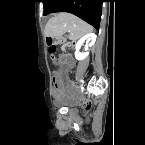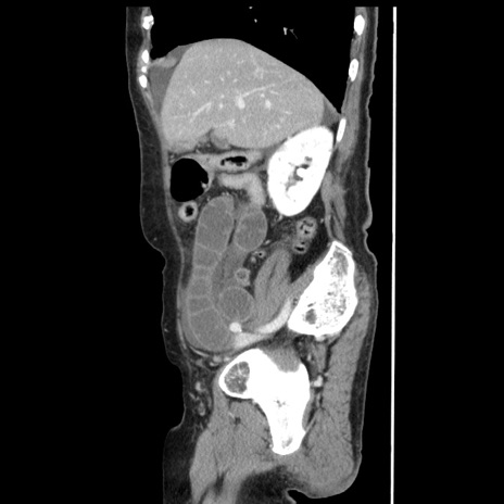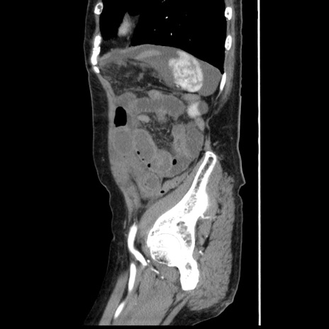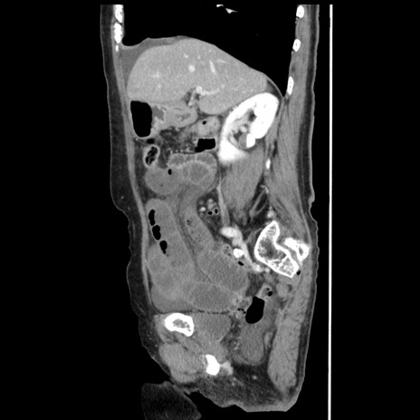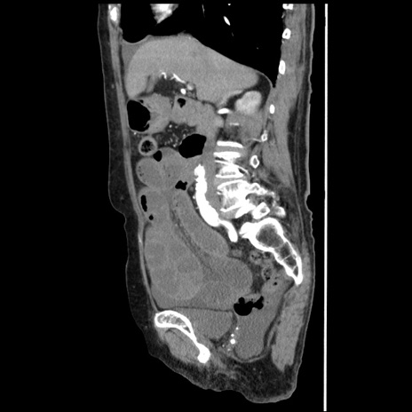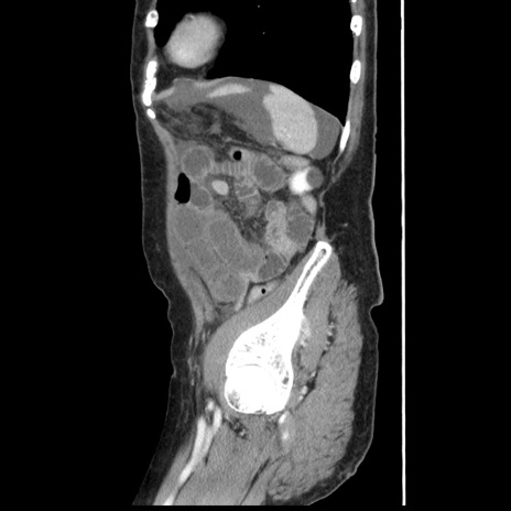 【症例】80歳代女性 【主訴】腹痛 【現病歴】8時間前から腹痛あり来院。 【既往歴】糖尿病、脂質異常症、子宮体癌にて子宮全摘術 【身体所見】意識清明・会話良好だが腹痛で苦悶様、全腹部にわたって反跳痛と圧痛あり 【データ】WBC 13600、CRP 0.14、LDH 224、CK 90