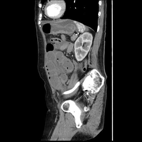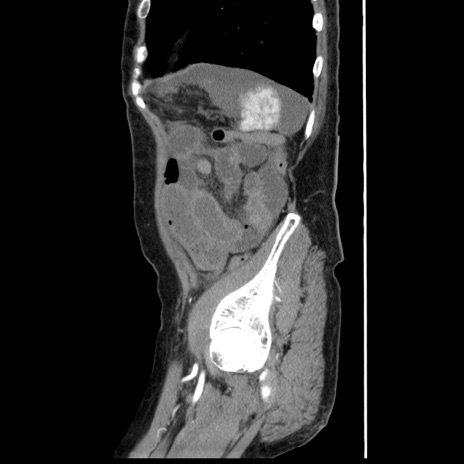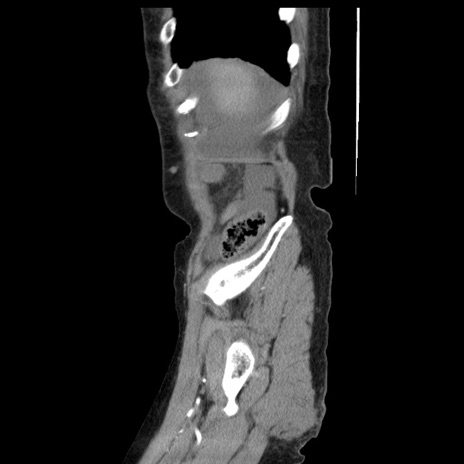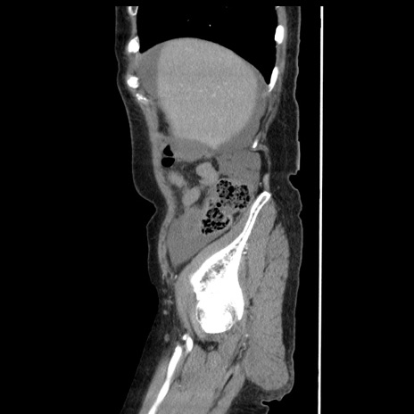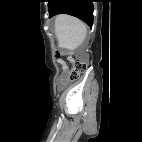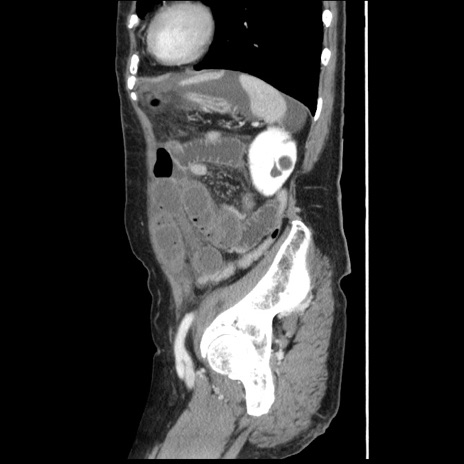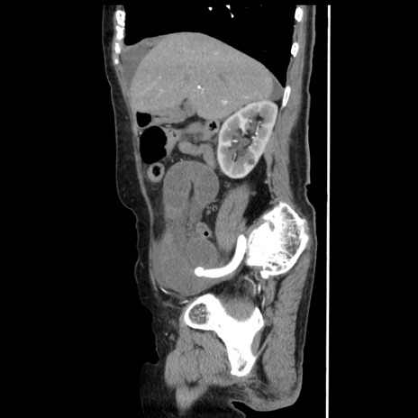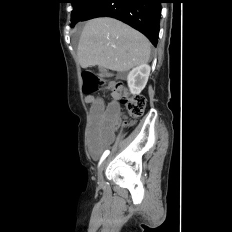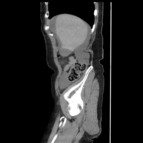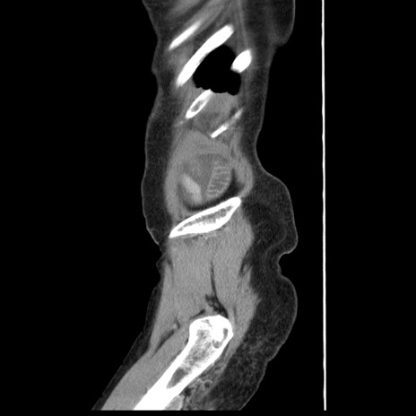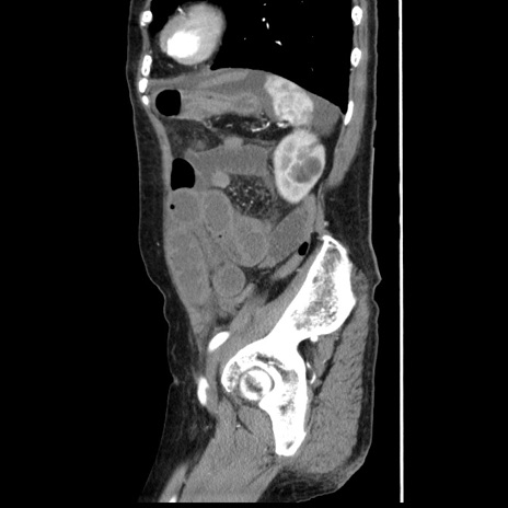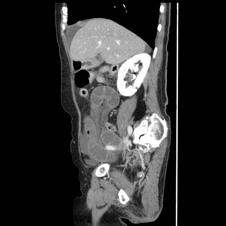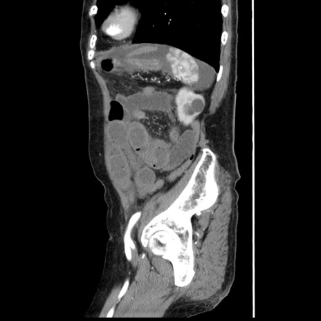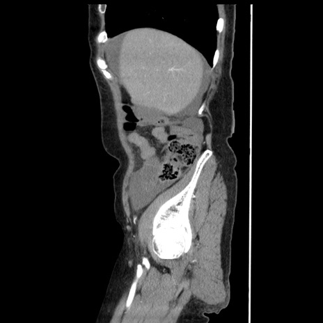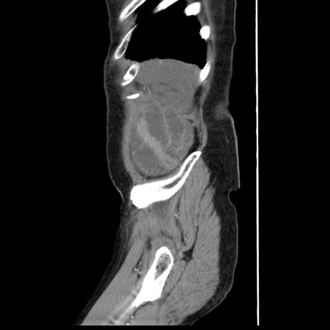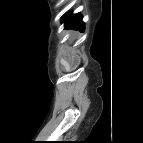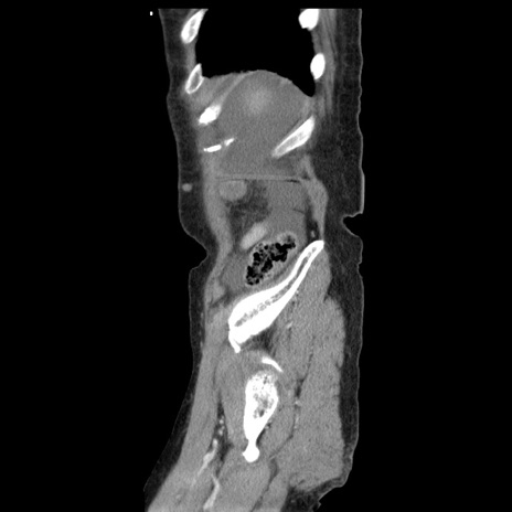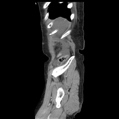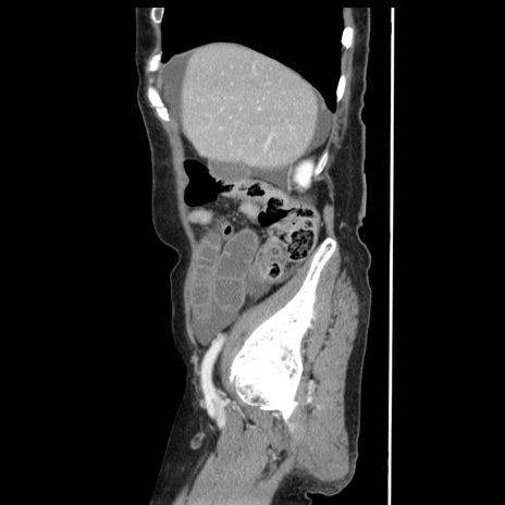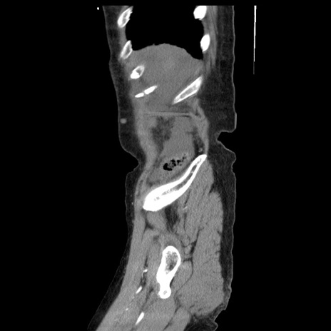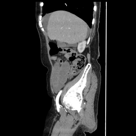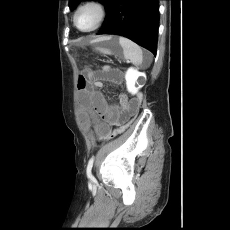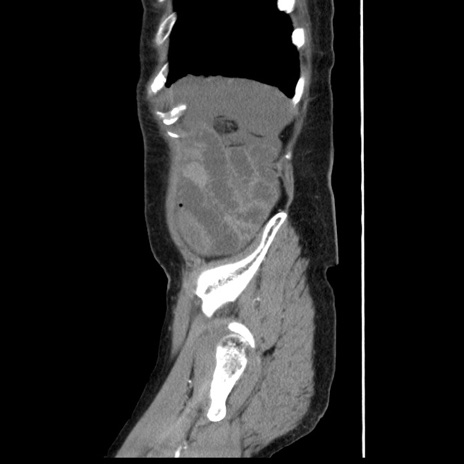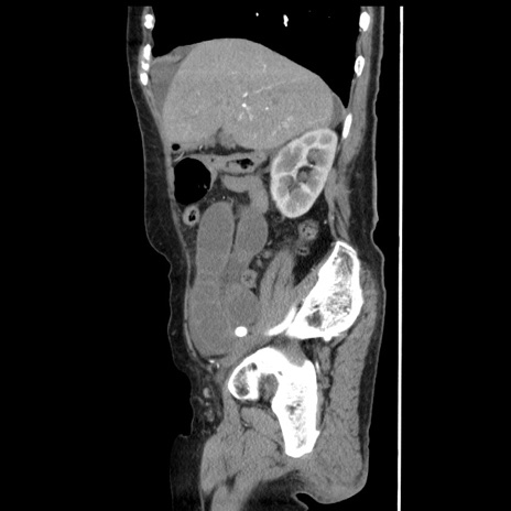 【症例】80歳代女性 【主訴】腹痛 【現病歴】8時間前から腹痛あり来院。 【既往歴】糖尿病、脂質異常症、子宮体癌にて子宮全摘術 【身体所見】意識清明・会話良好だが腹痛で苦悶様、全腹部にわたって反跳痛と圧痛あり 【データ】WBC 13600、CRP 0.14、LDH 224、CK 90