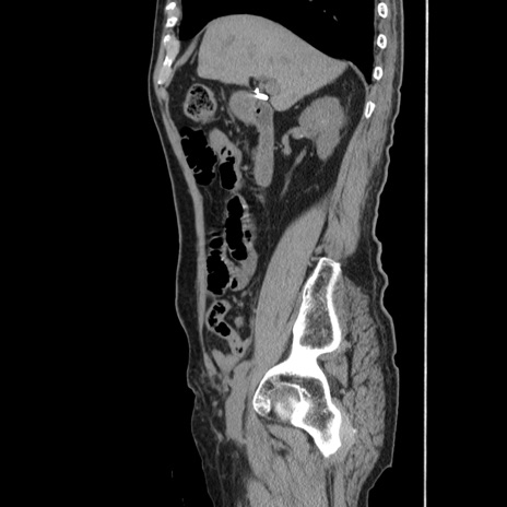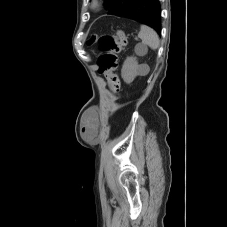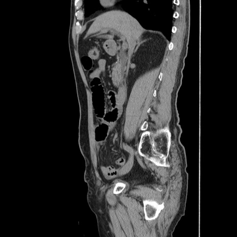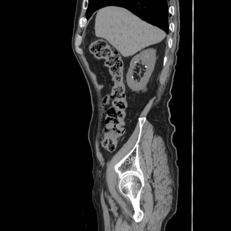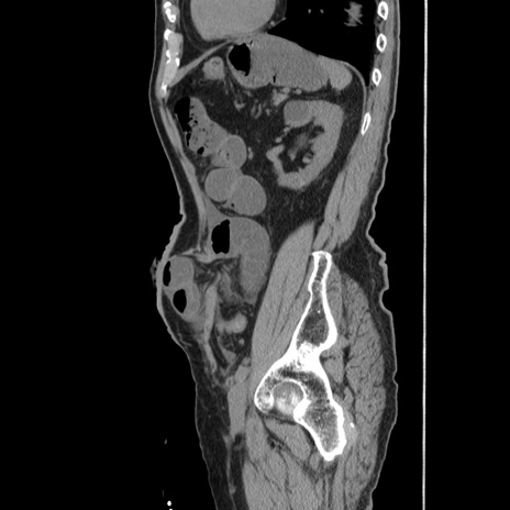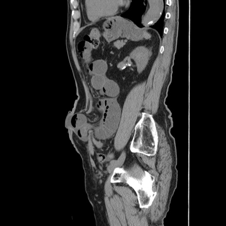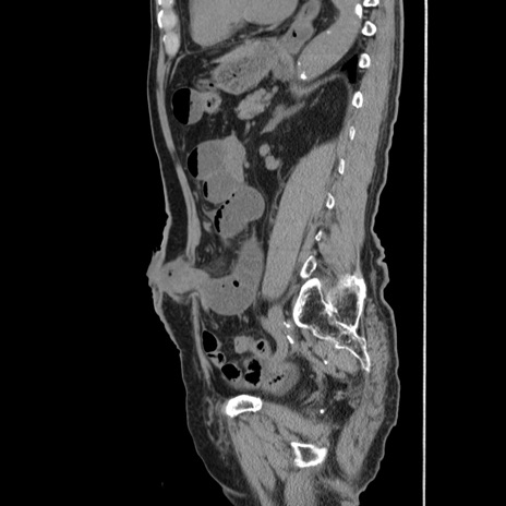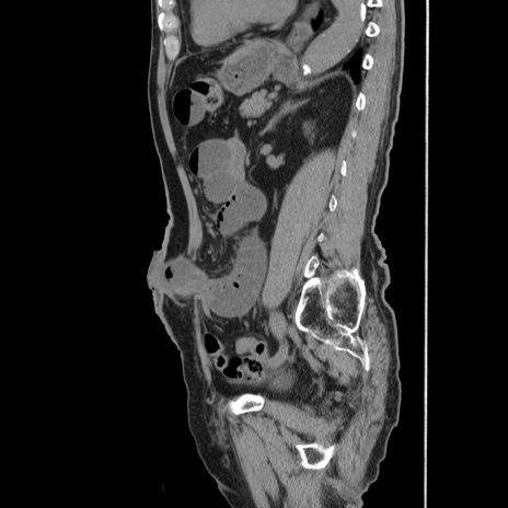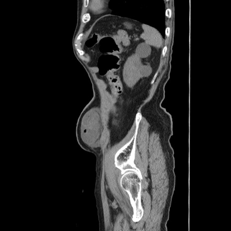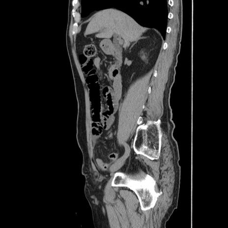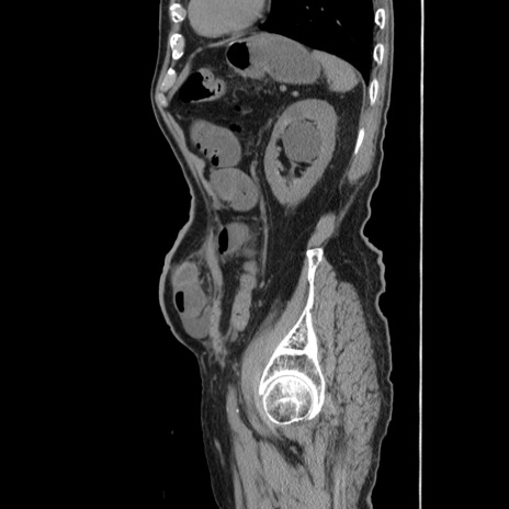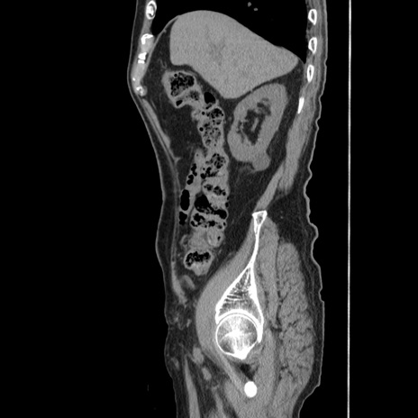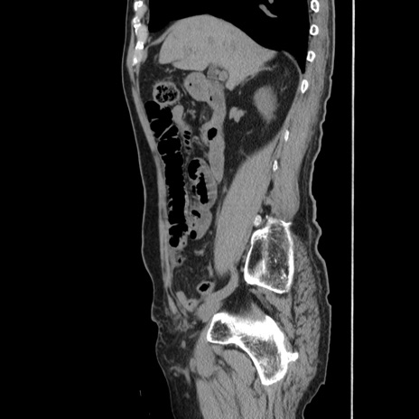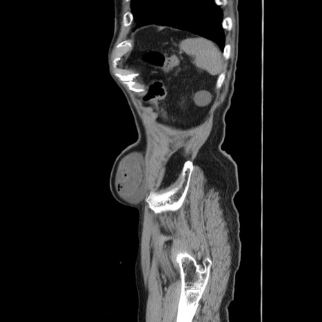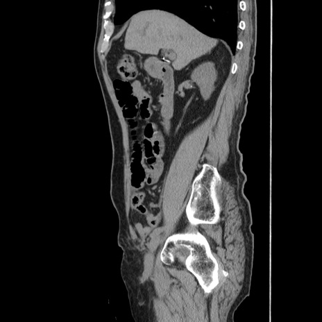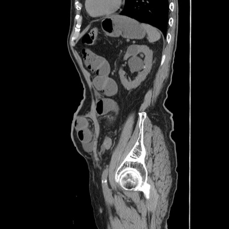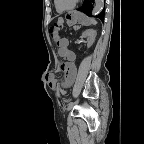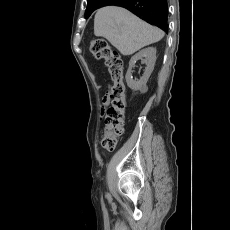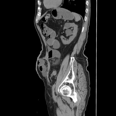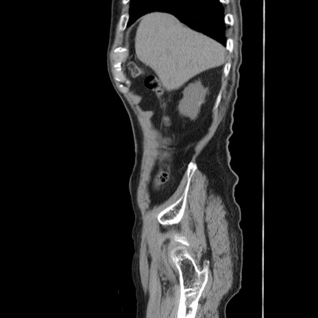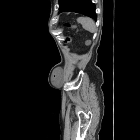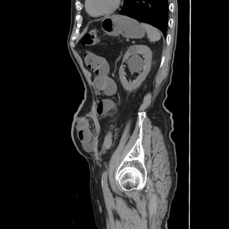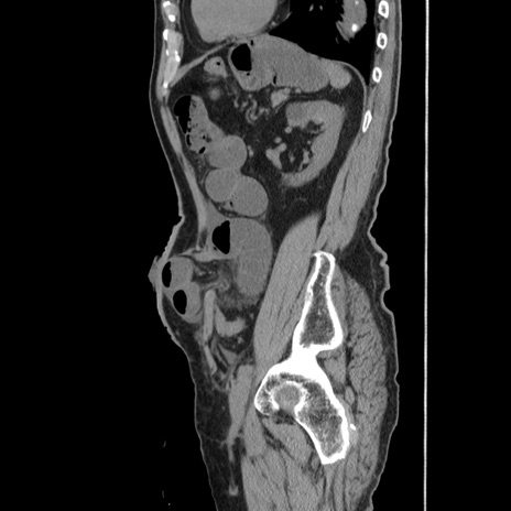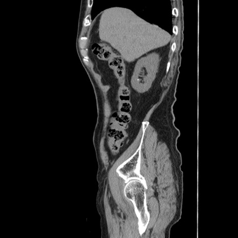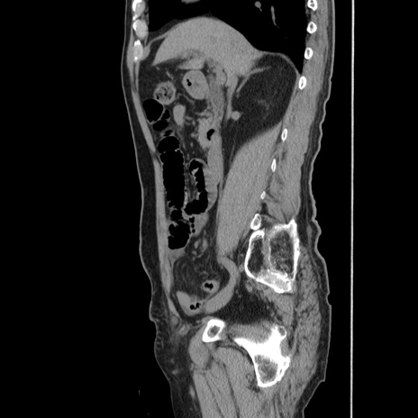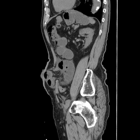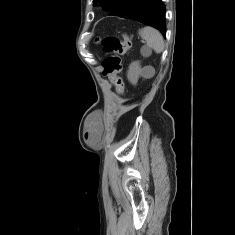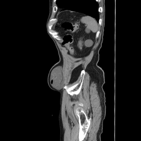 【症例】80歳代男性 【主訴】左側腹部痛、嘔吐 【現病歴】本日早朝より左腹部に痛みあり。昼頃嘔吐認めたため、救急要請。 【既往歴】直腸癌(Mile手術)、胆摘 【身体所見】意識清明、BT 35.9℃、BP 221/93mmHg、SpO2 97%(RA) 、腹部:左ストーマ周囲に限局性の腹部膨隆あり。 膨隆部自発痛・圧痛あり・軟。 【データ】WBC 7700、CRP 0.09