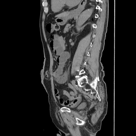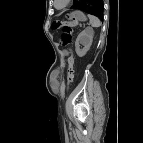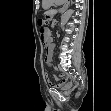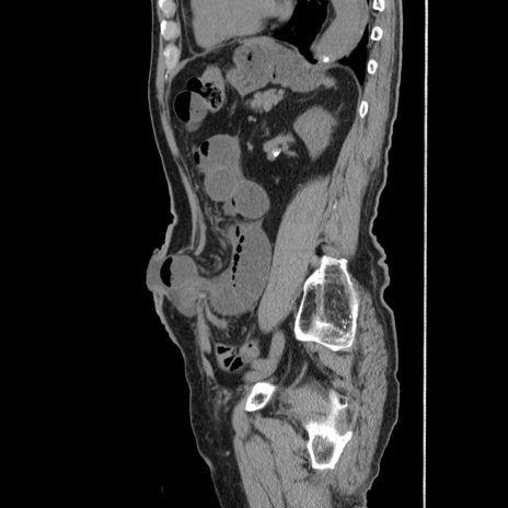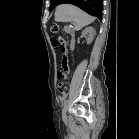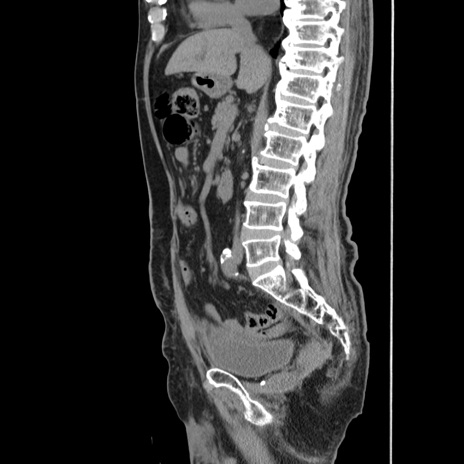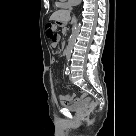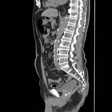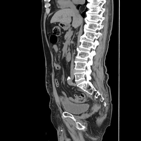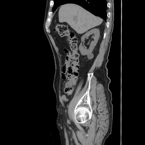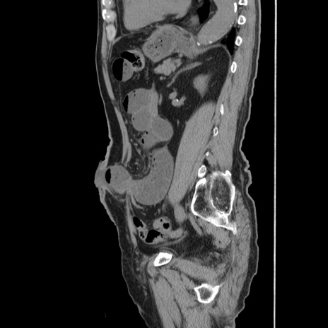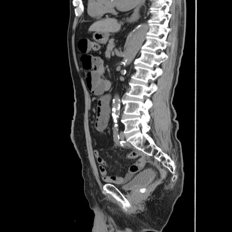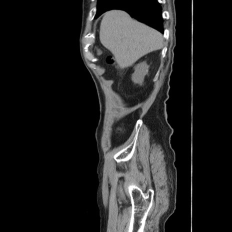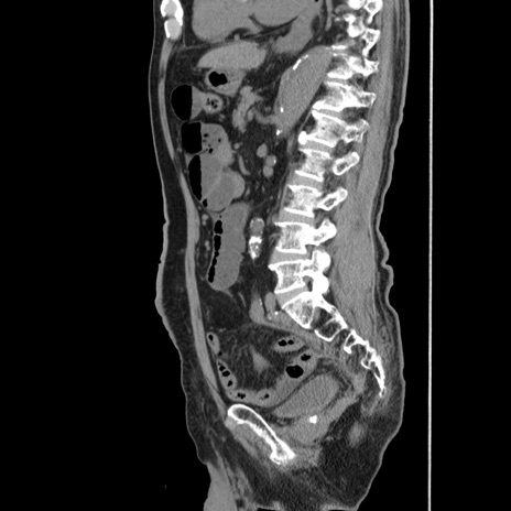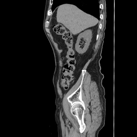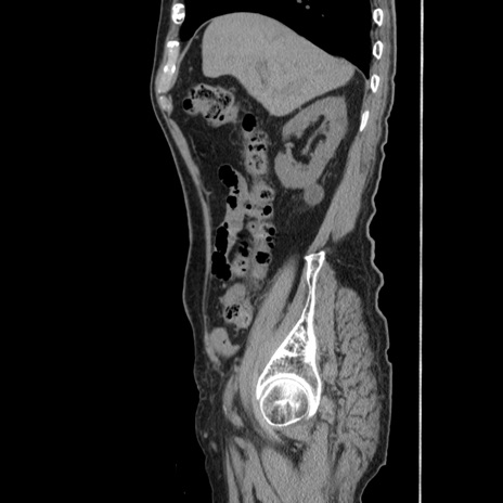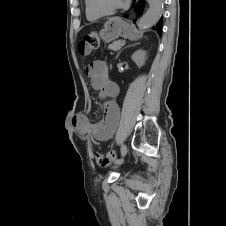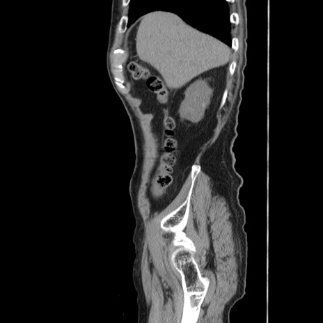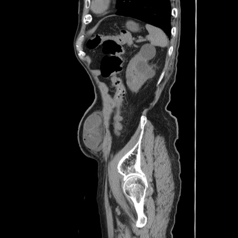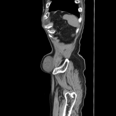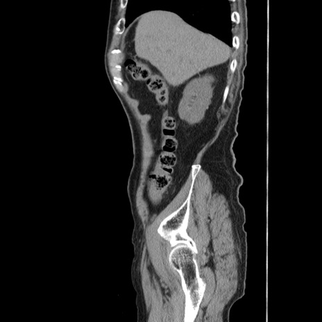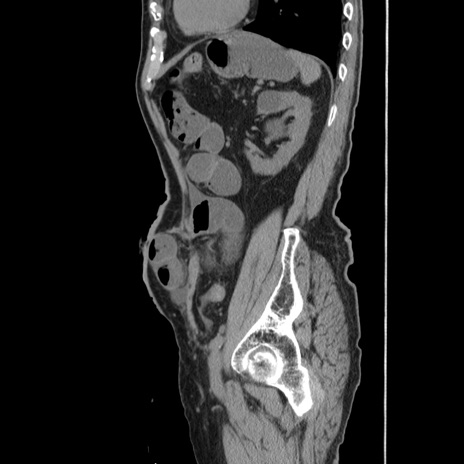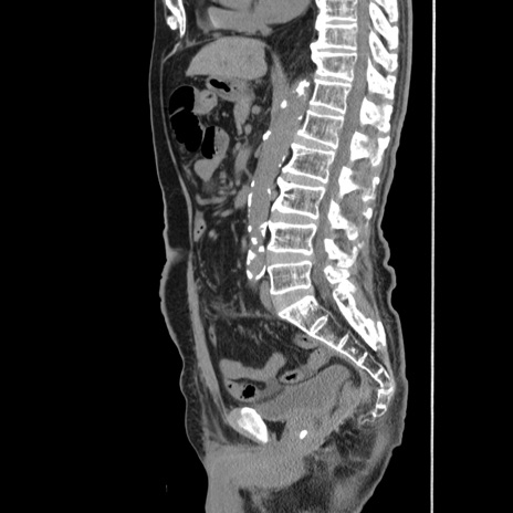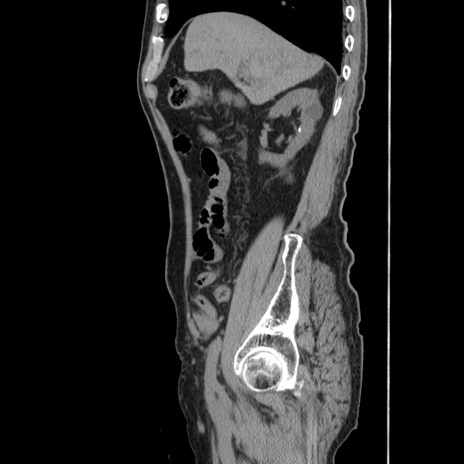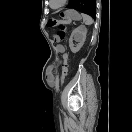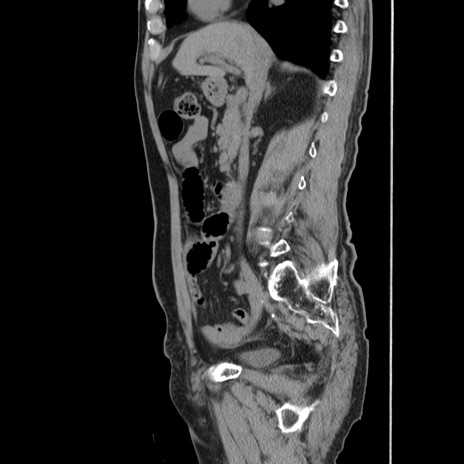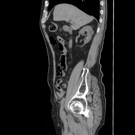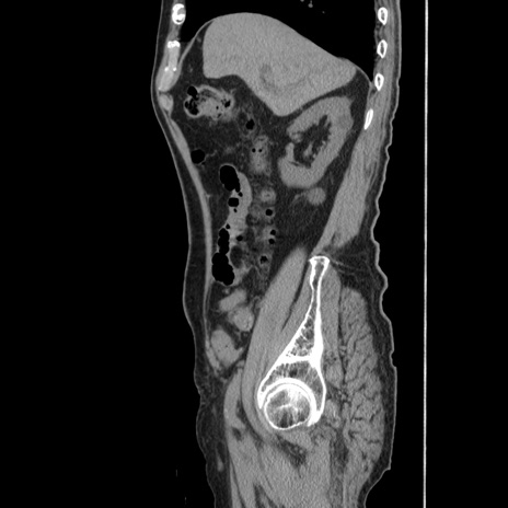 【症例】80歳代男性 【主訴】左側腹部痛、嘔吐 【現病歴】本日早朝より左腹部に痛みあり。昼頃嘔吐認めたため、救急要請。 【既往歴】直腸癌(Mile手術)、胆摘 【身体所見】意識清明、BT 35.9℃、BP 221/93mmHg、SpO2 97%(RA) 、腹部:左ストーマ周囲に限局性の腹部膨隆あり。 膨隆部自発痛・圧痛あり・軟。 【データ】WBC 7700、CRP 0.09