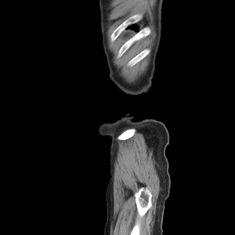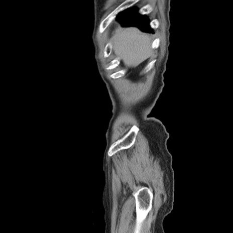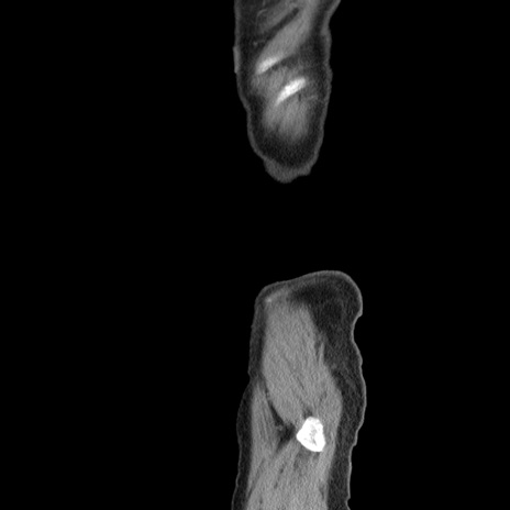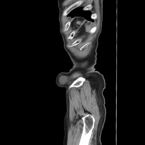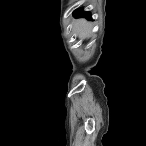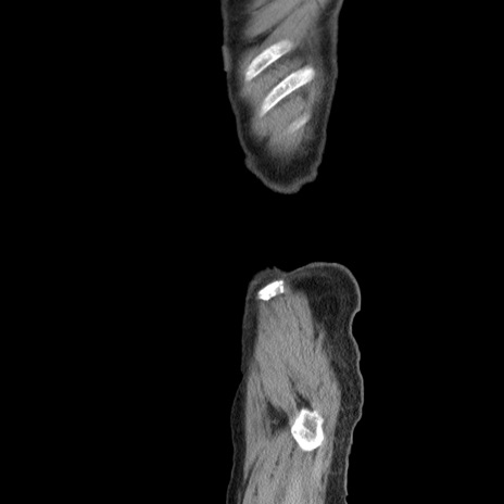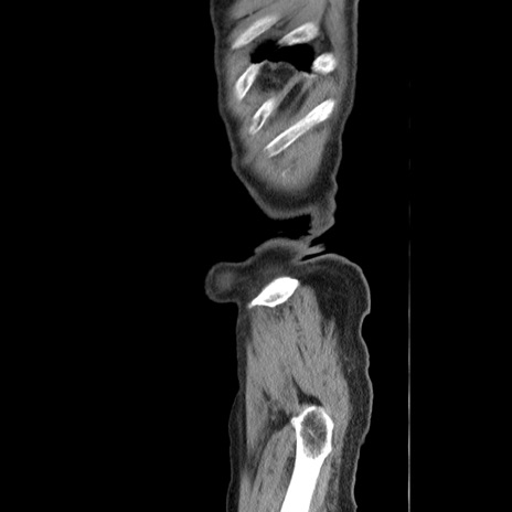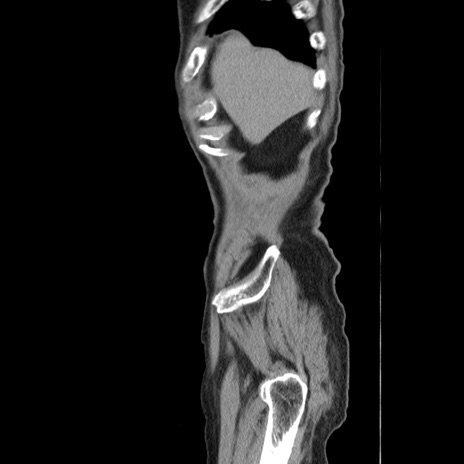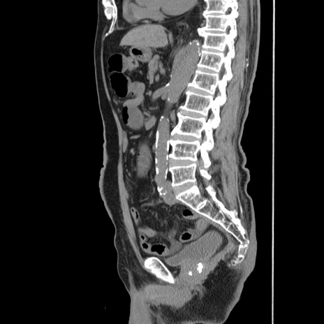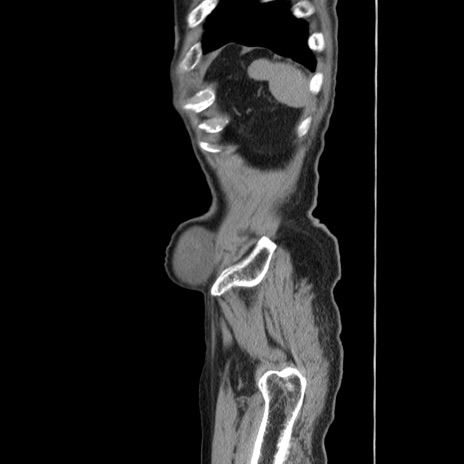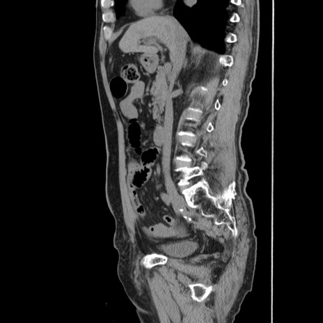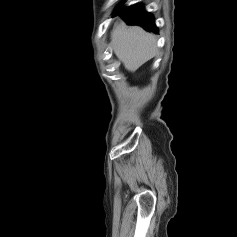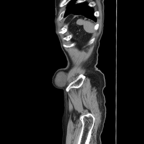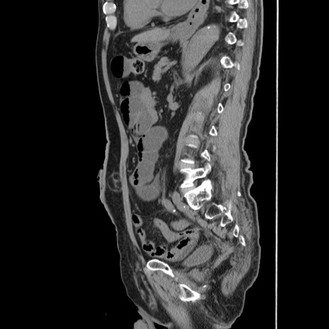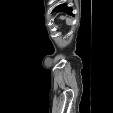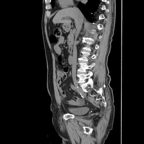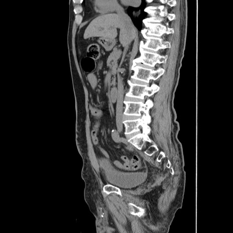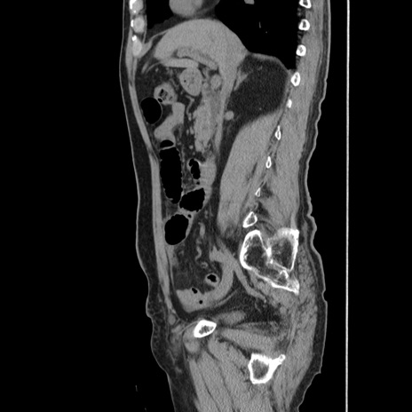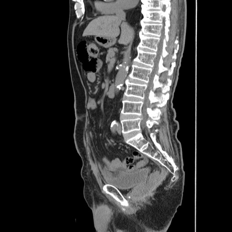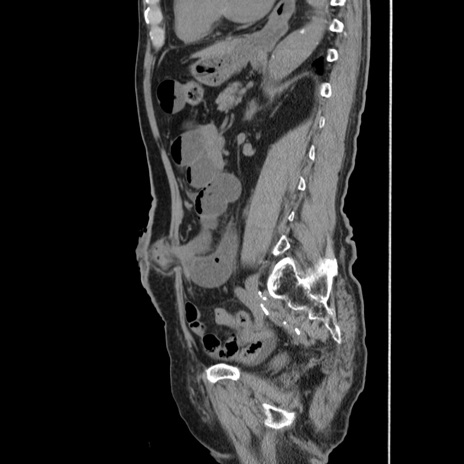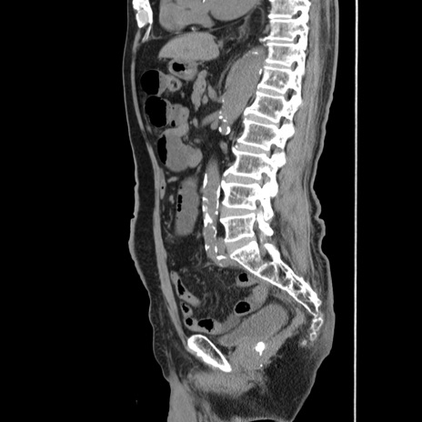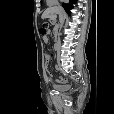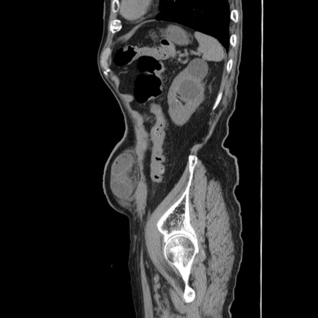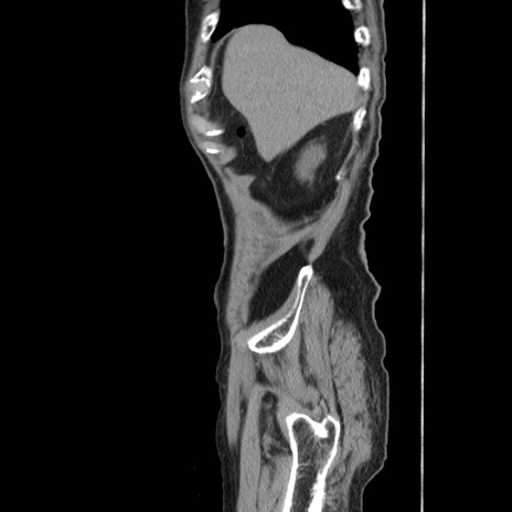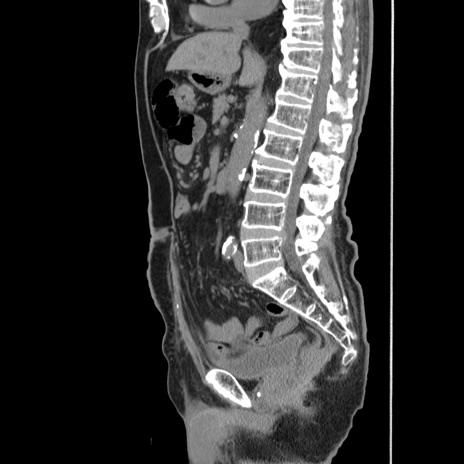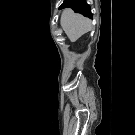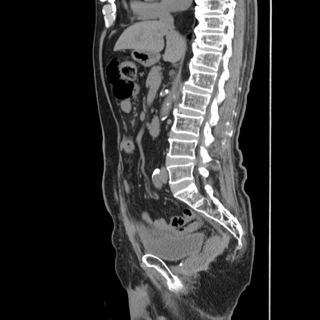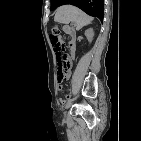 【症例】80歳代男性 【主訴】左側腹部痛、嘔吐 【現病歴】本日早朝より左腹部に痛みあり。昼頃嘔吐認めたため、救急要請。 【既往歴】直腸癌(Mile手術)、胆摘 【身体所見】意識清明、BT 35.9℃、BP 221/93mmHg、SpO2 97%(RA) 、腹部:左ストーマ周囲に限局性の腹部膨隆あり。 膨隆部自発痛・圧痛あり・軟。 【データ】WBC 7700、CRP 0.09